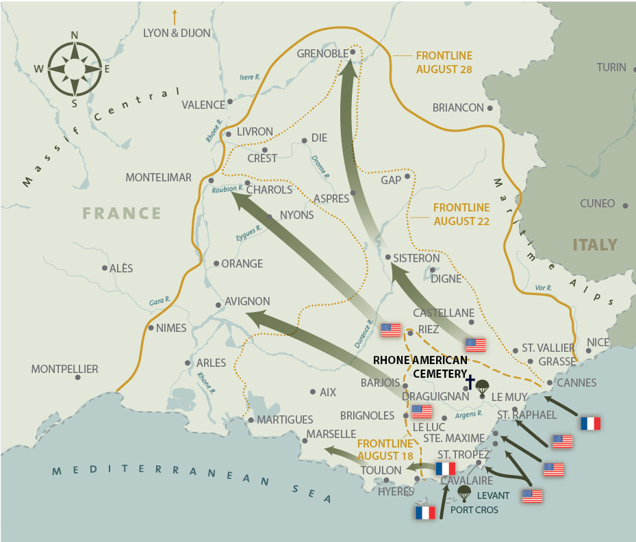 The site of the Rhone American Cemetery and Memorial in France was selected because of its historic location along the route of the U.S. Seventh Army’s drive up the Rhone Valley. It was established on August 19, 1944 after the Seventh Army’s surprise landing in southern France.