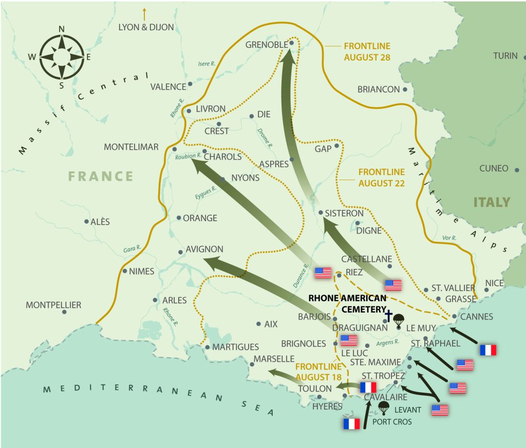 The site of the Rhone American Cemetery and Memorial in France was selected because of its historic location along the route of the U.S. Seventh Army’s drive up the Rhone Valley. It was established on August 19, 1944 after the Seventh Army’s surprise landing in southern France.
