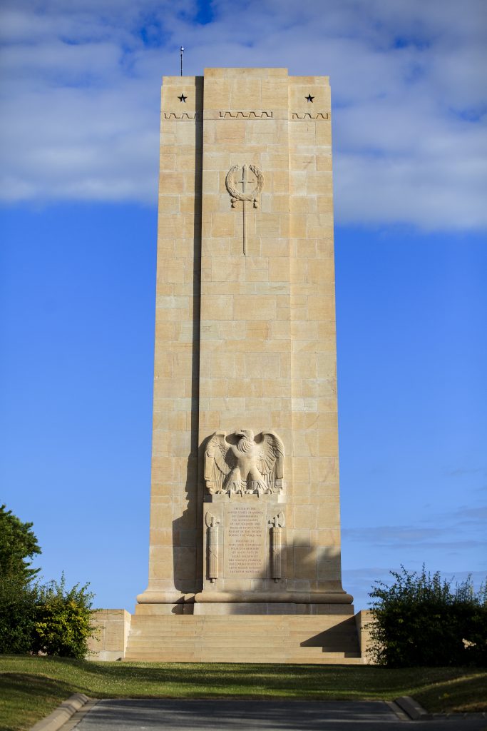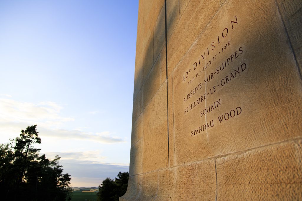 The monument, situated on Blanc Mont Ridge, is surrounded by vestiges of World War I trenches, dugouts and gun emplacements. It is essentially a tower of golden-yellow limestone with an observation tower on top affording an excellent view of the battlefields. Inside the entrance to the monument is an inscription describing American operations in the vicinity. The monument’s site was captured by American troops.