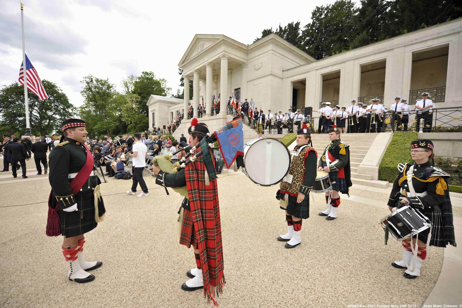 A bagpiper and drummers participate in the 2015 Memorial Day Ceremony at Suresnes American Cemetery. Image courtesy of Jean Marc Cresson.