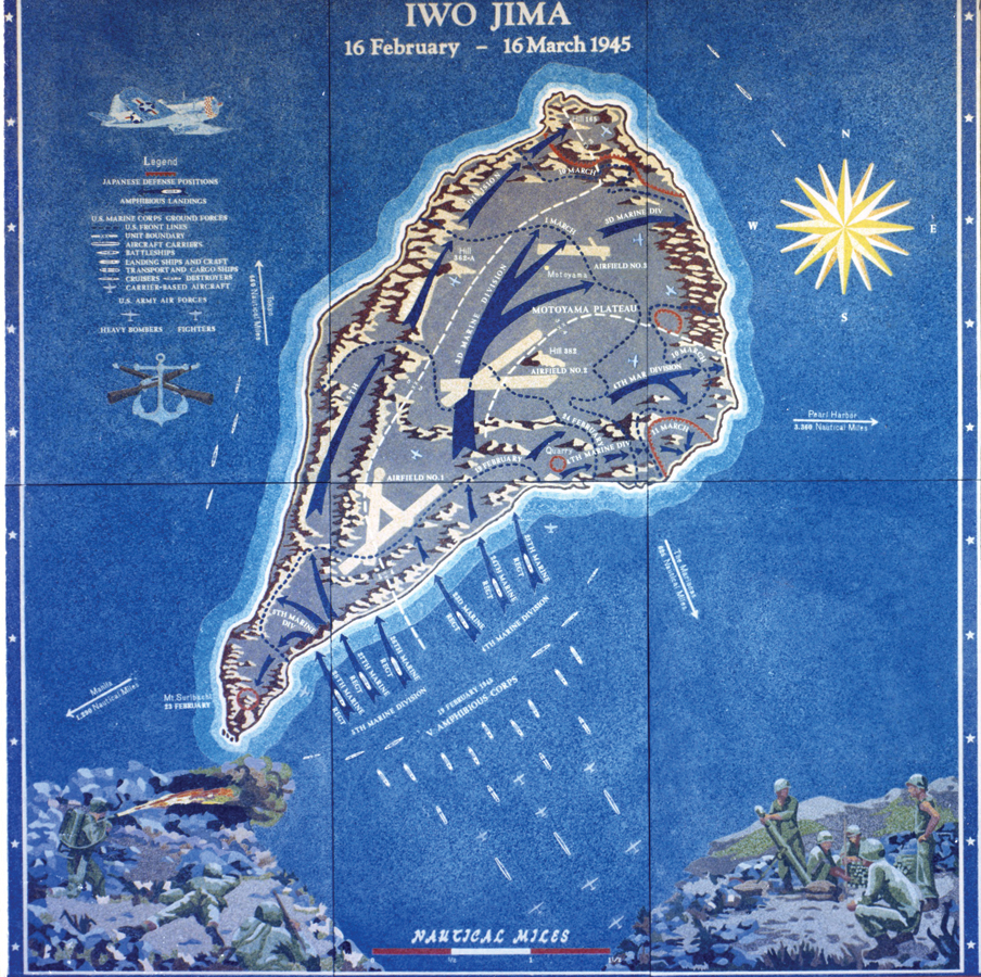 A battle map showing troop movement near Iwo Jima is at the Honolulu Memorial.