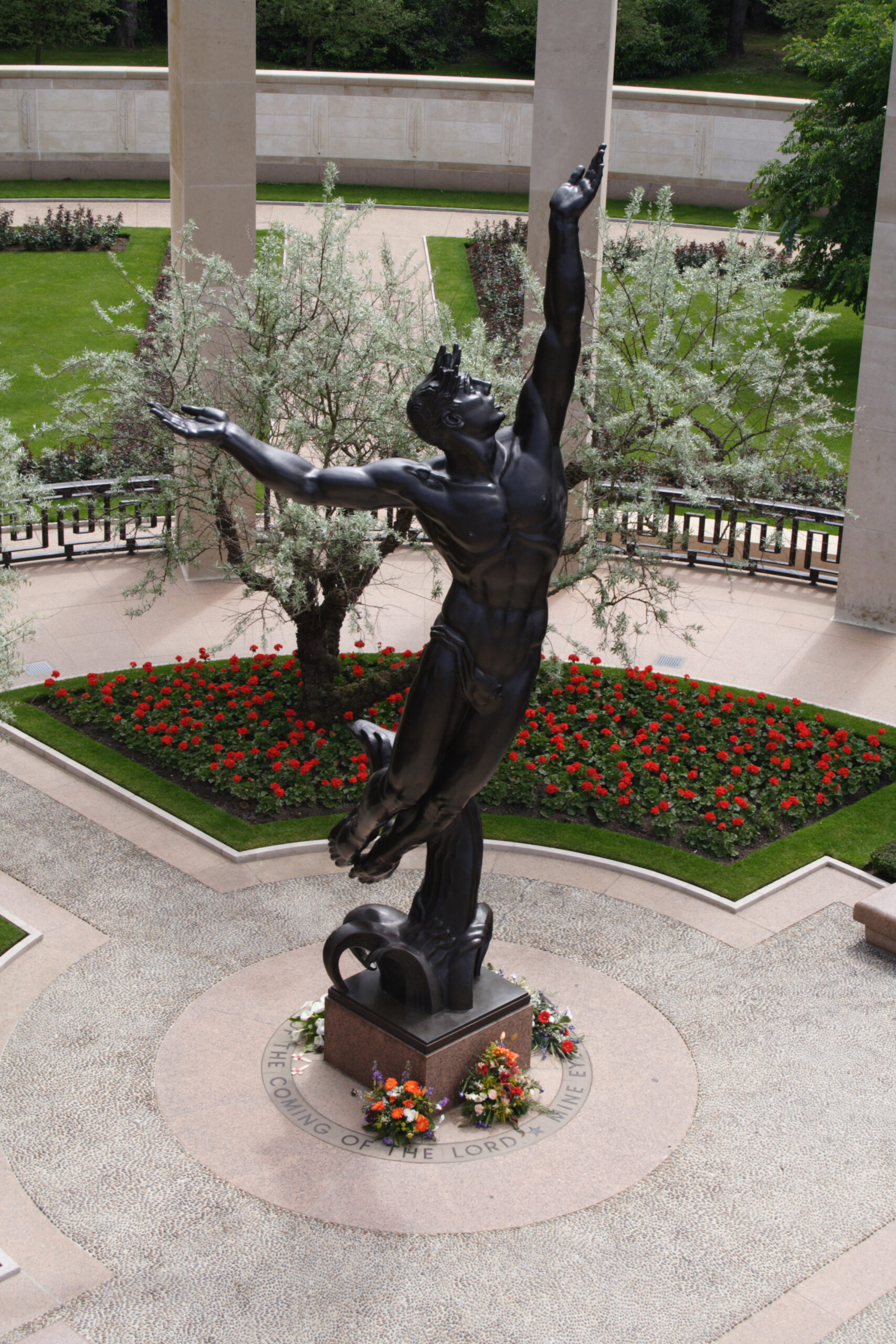 A bronze sculpture is at the center of the Normandy American Cemetery memorial area.