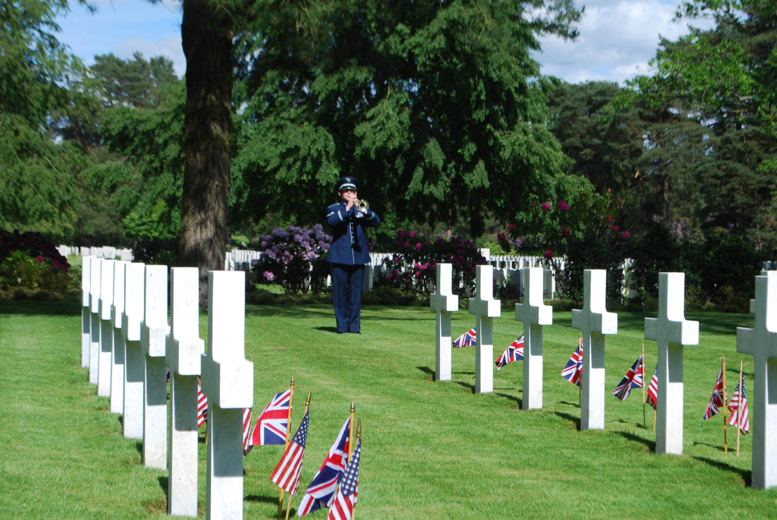 A bugler plays during the 2014 Memorial Day Ceremony at Brookwood American Cemetery in England.