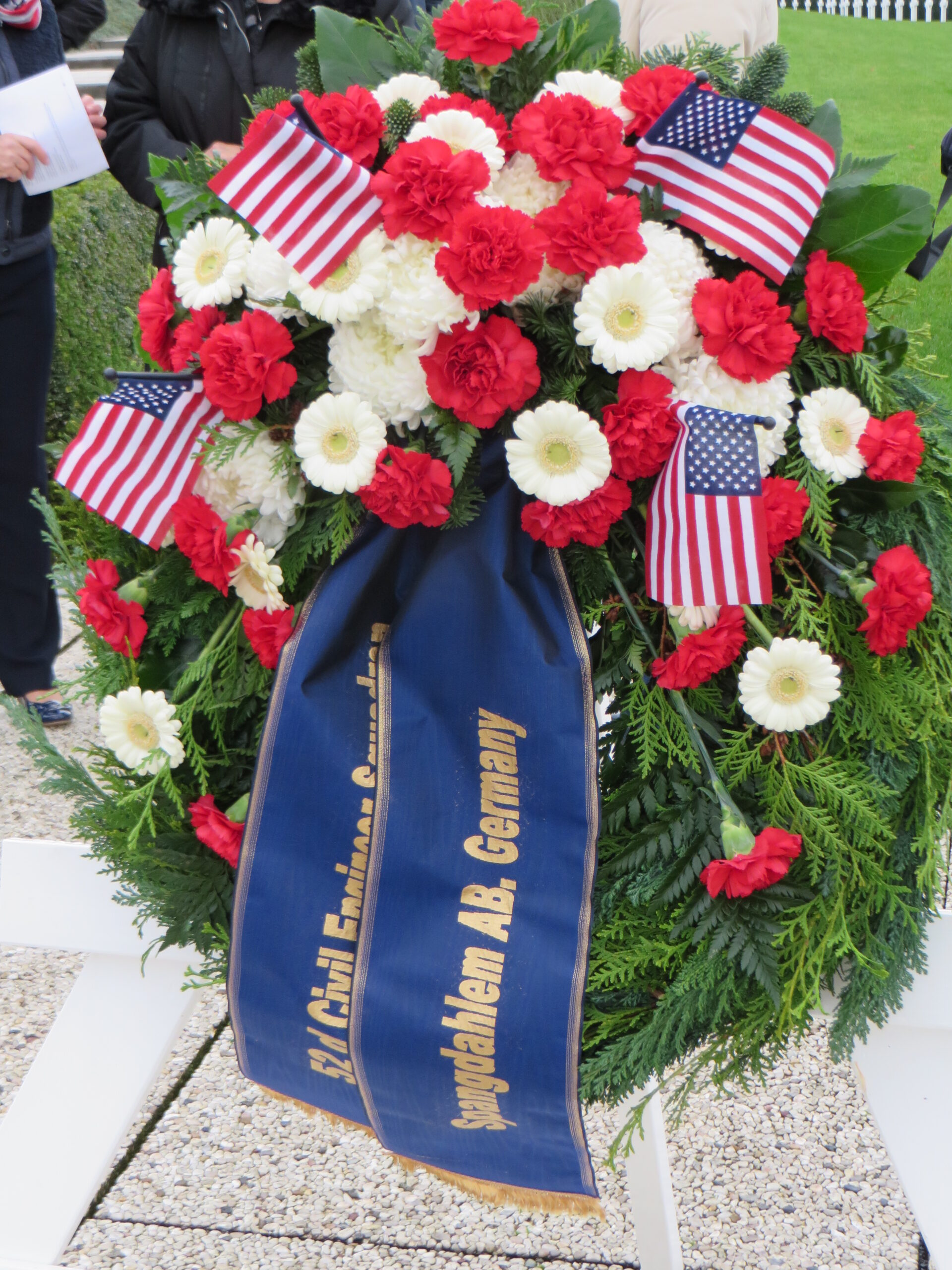 A floral wreath presented on behalf of one of the units from Spangdahlem Air Base in Germany was laid during the 2014 Veterans Day Ceremony at Henri-Chapelle American Cemetery.