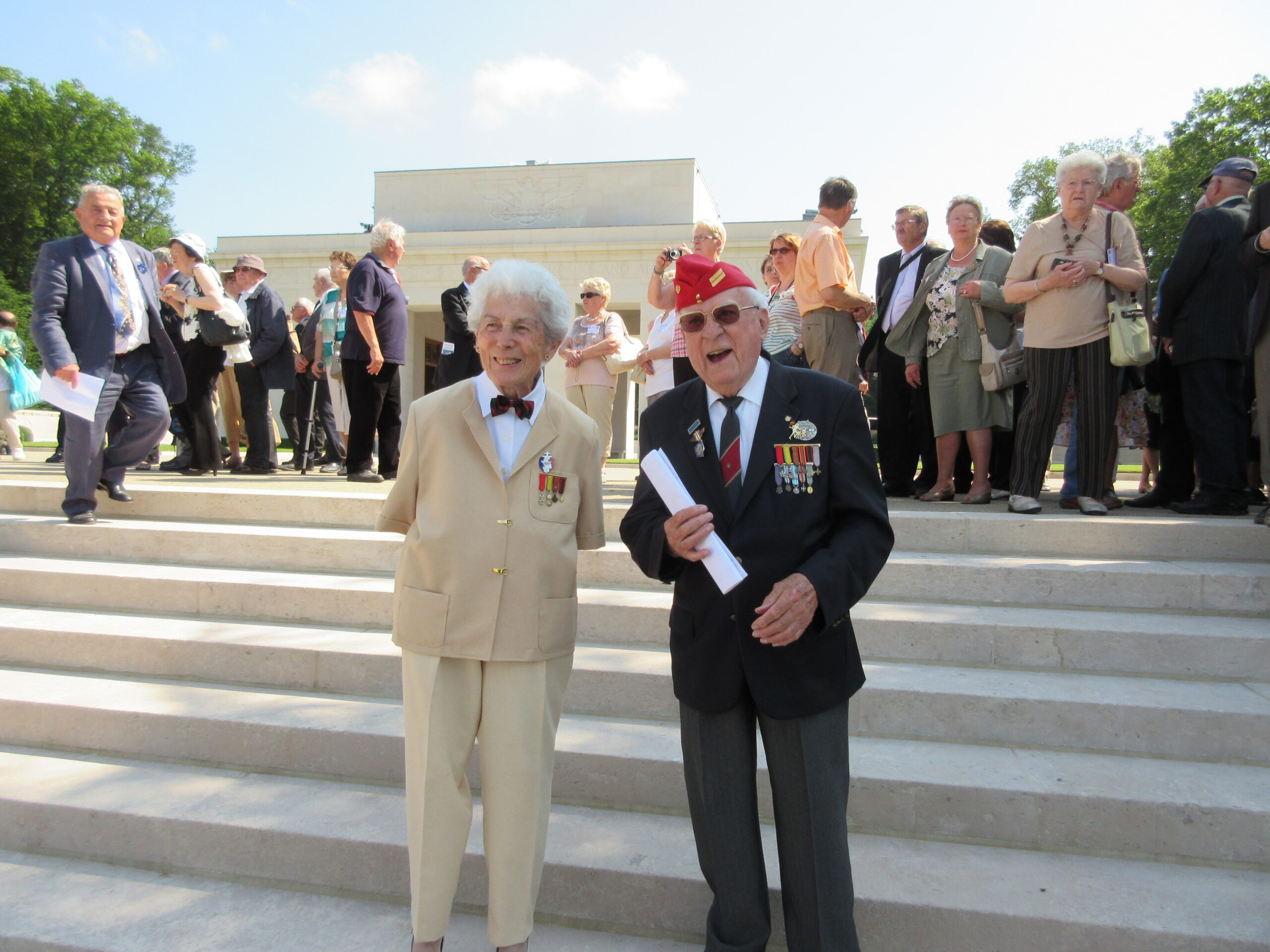 A French man and woman, both veterans of Normandy, stand in front of the chapel.