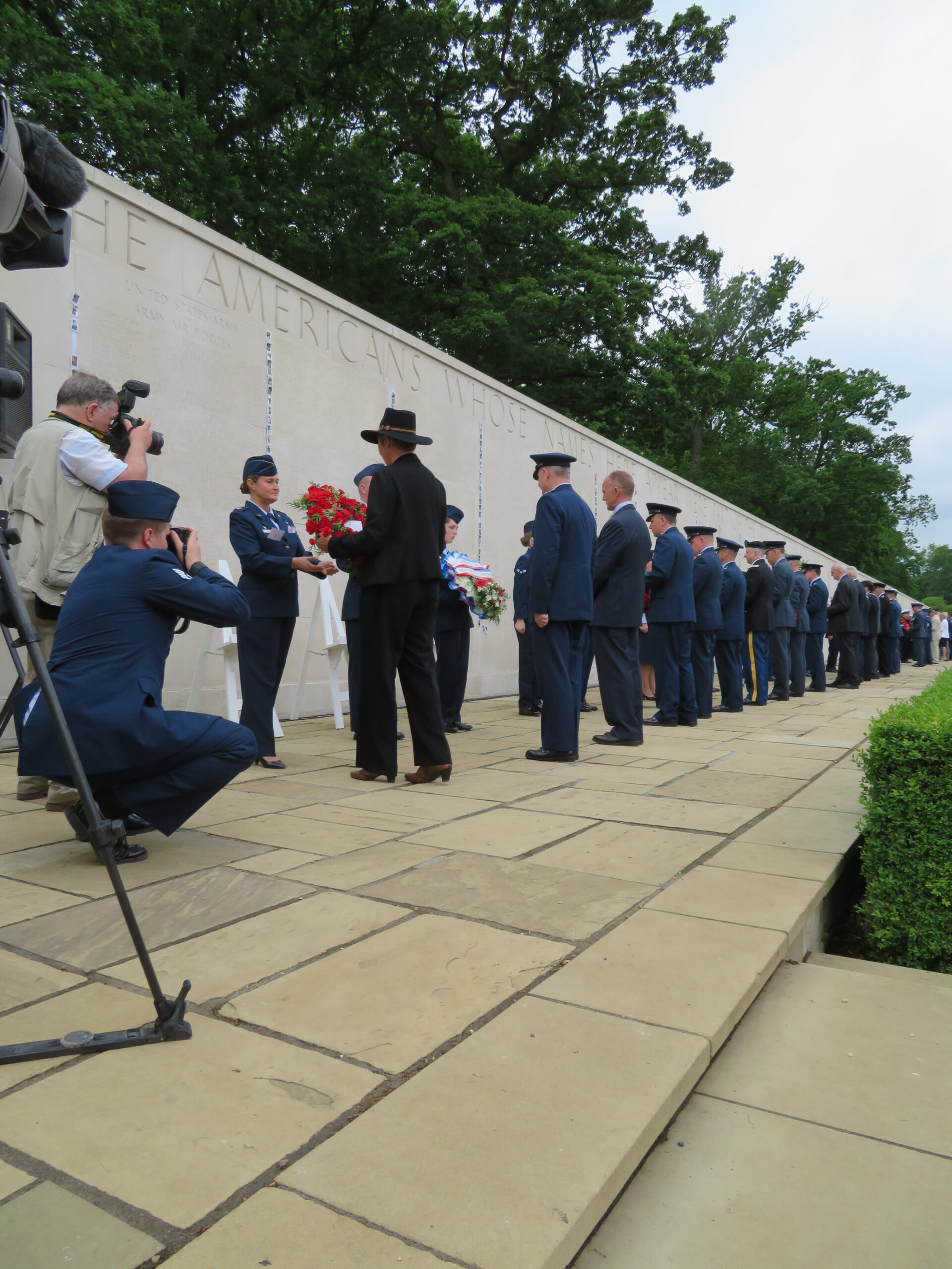 A long line of people prepare to lay wreaths at the Wall of the Missing.