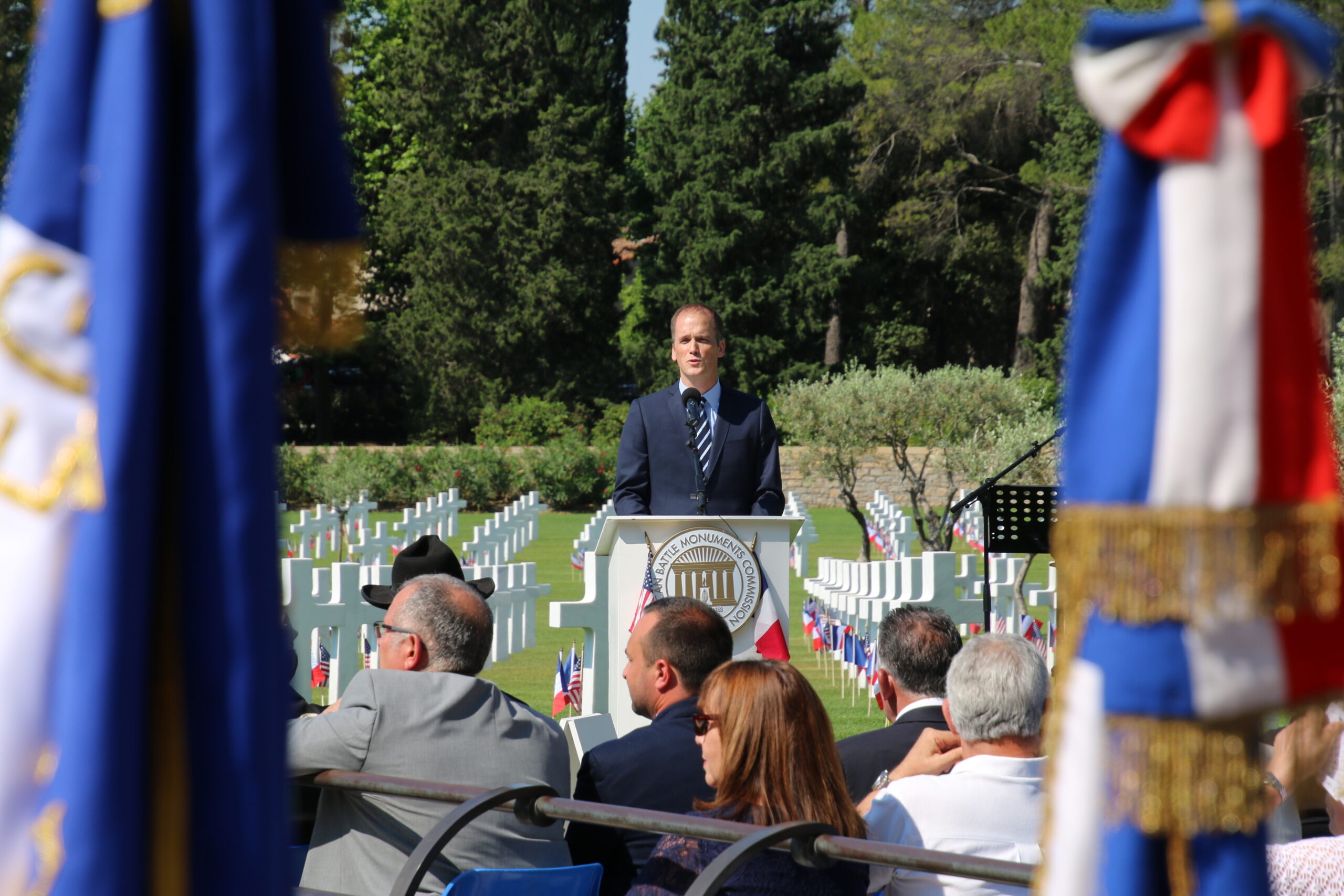 A man delivers remarks during the 2017 Memorial Day Ceremony at Rhone American Cemetery. Image courtesy of Michael Delanoy.