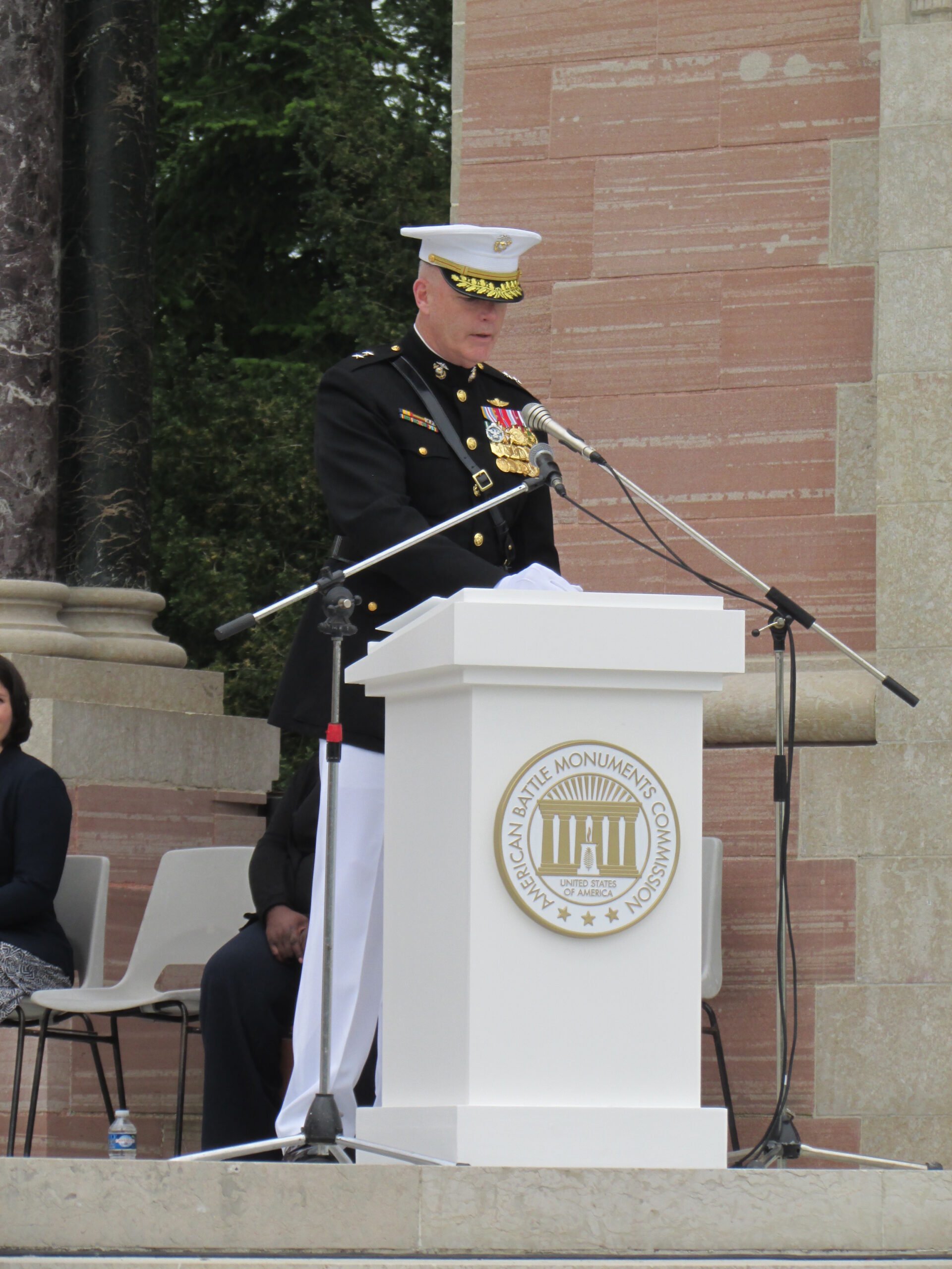 A man in a Marine uniform speaks from a podium.