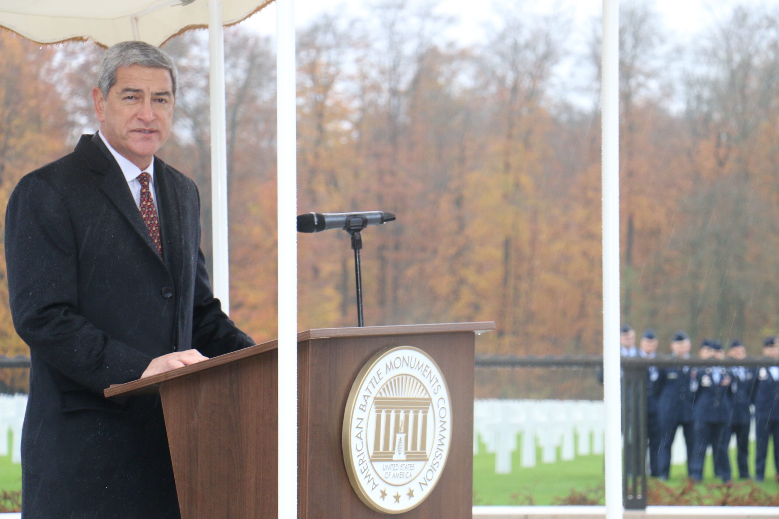 A man in a suit and jacket delivers remarks from the podium.
