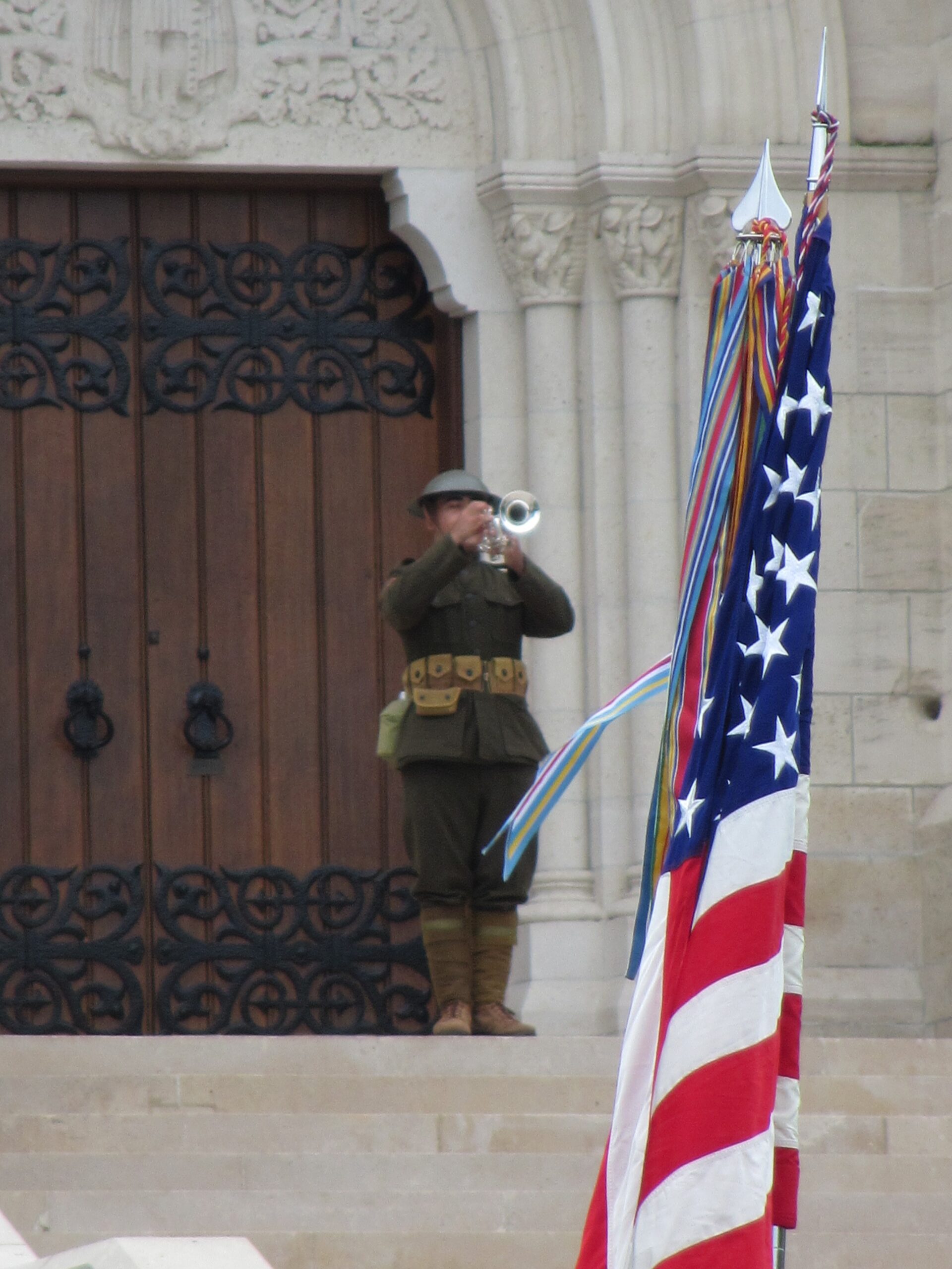 A man in a WWI era uniform plays the bugle on the steps of the chapel.