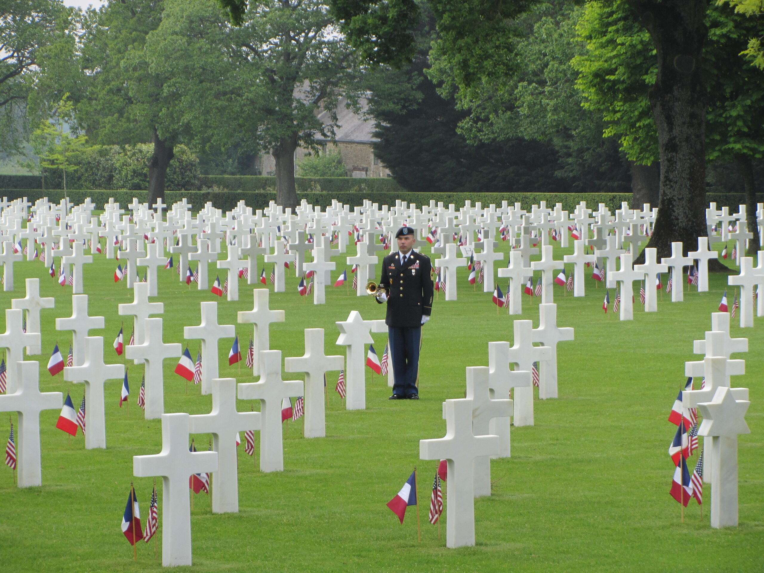 MSgt. Laurence Dean of the U.S. Army Europe Band and Chorus waits to play "Taps" during the 2016 Memorial Day Ceremony at Brittany American Cemetery.