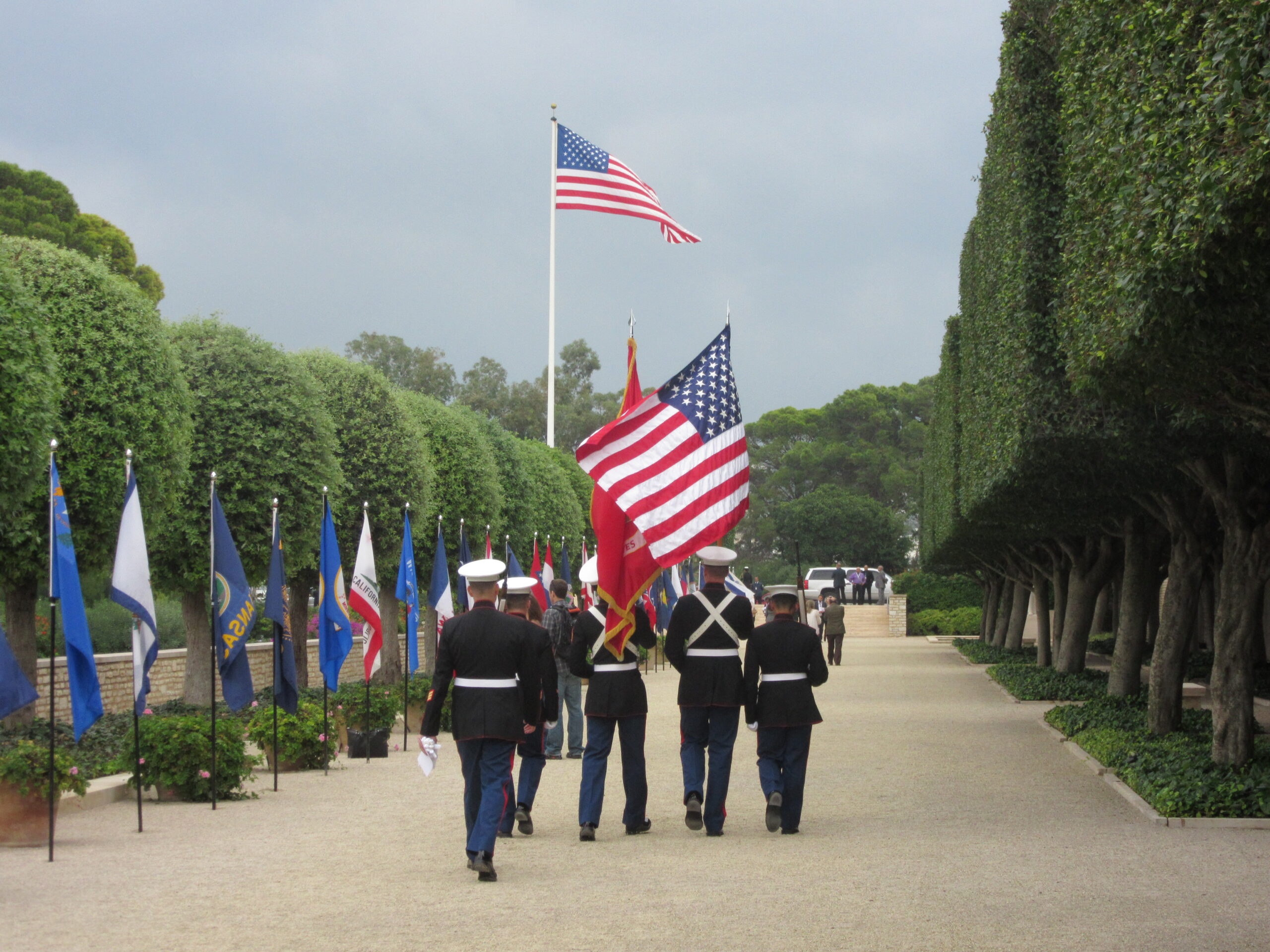 A Marine Honor Guard marches out of the cemetery after the ceremony.