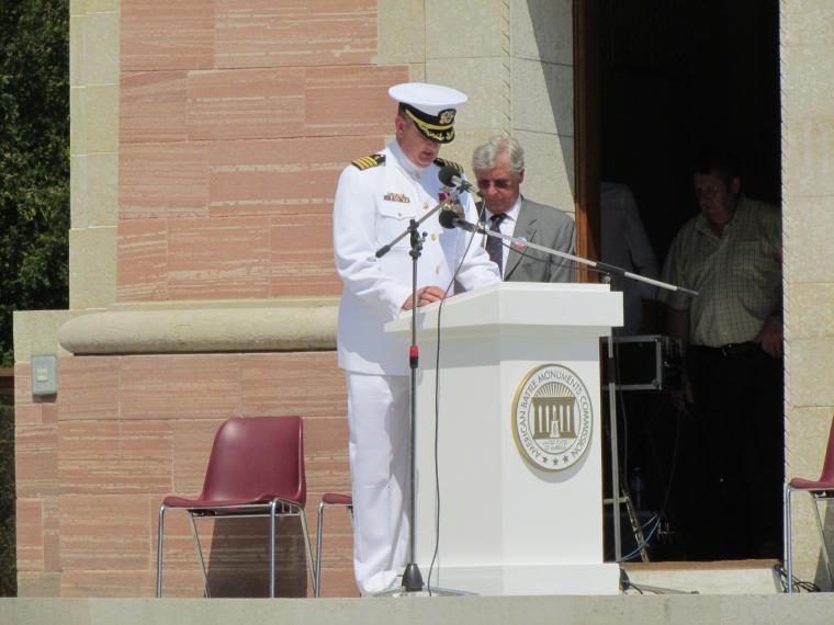 A member of the U.S. military delivers remarks during the 2017 Memorial Day Ceremony at Oise-Aisne American Cemetery.