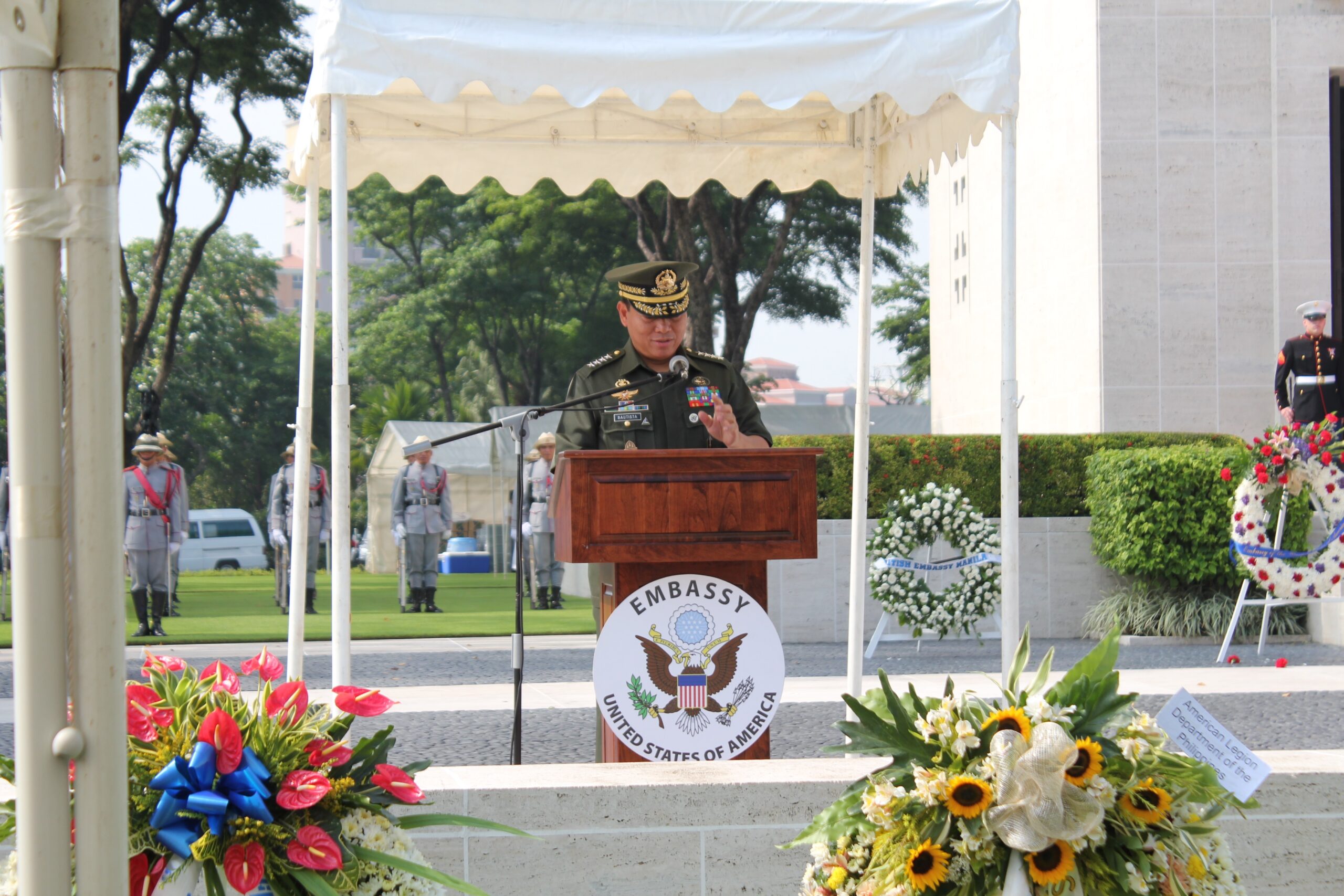 A Philippines military official delivers remarks during the 2013 Memorial Day ceremony at Manila American Cemetery in the Philippines.