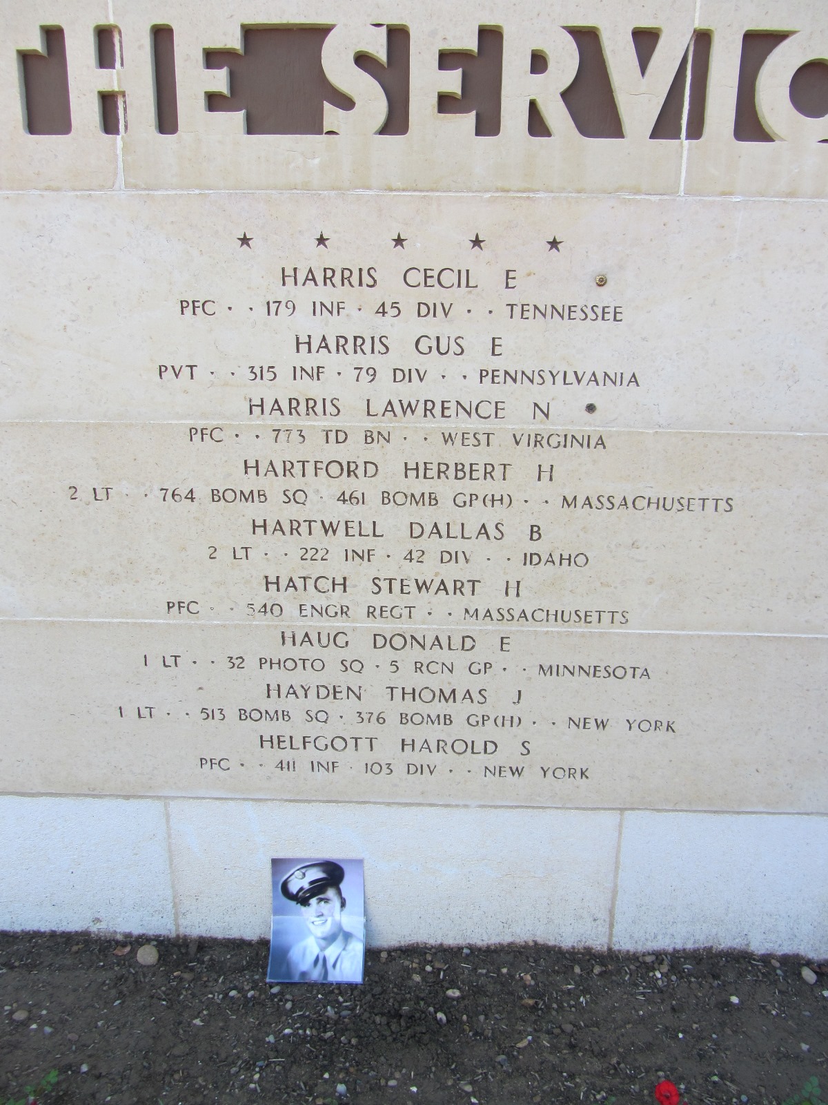 A photo of Pfc. Cecil Harris is seen next his name on the Wall of the Missing at Epinal American Cemetery.