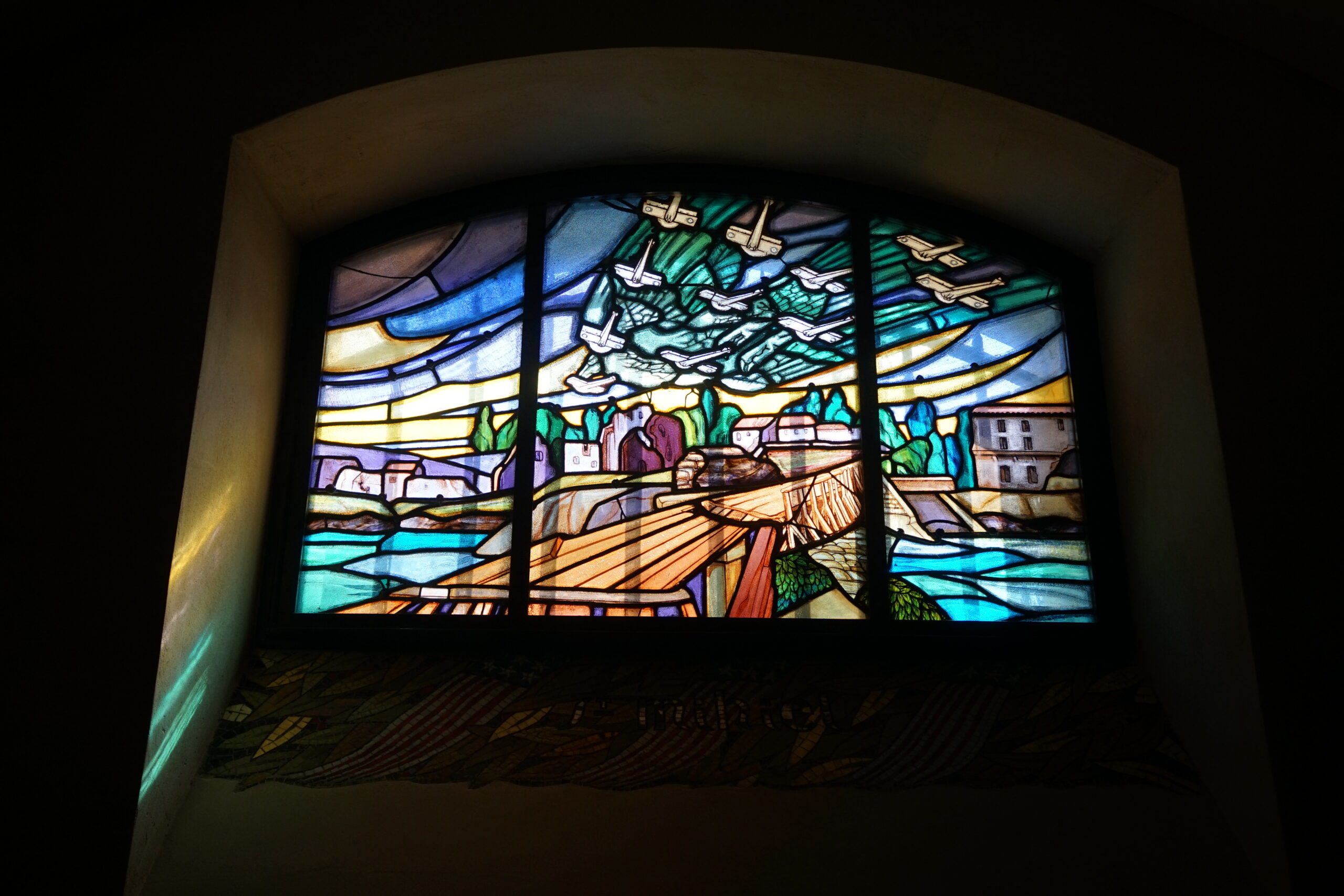 Intricate stained-glass windows can be seen from inside the crypt at the Lafayette Escadrille Memorial Cemetery.