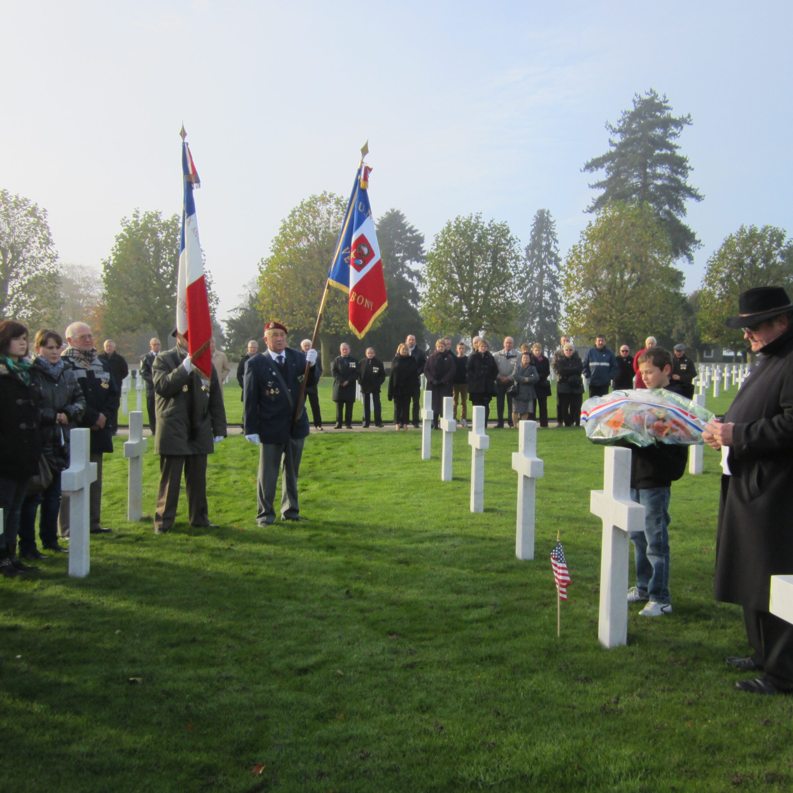 A student prepares to lay flowers at a headstone during the 2013 Veterans Day Ceremony at Somme American Cemetery in France.