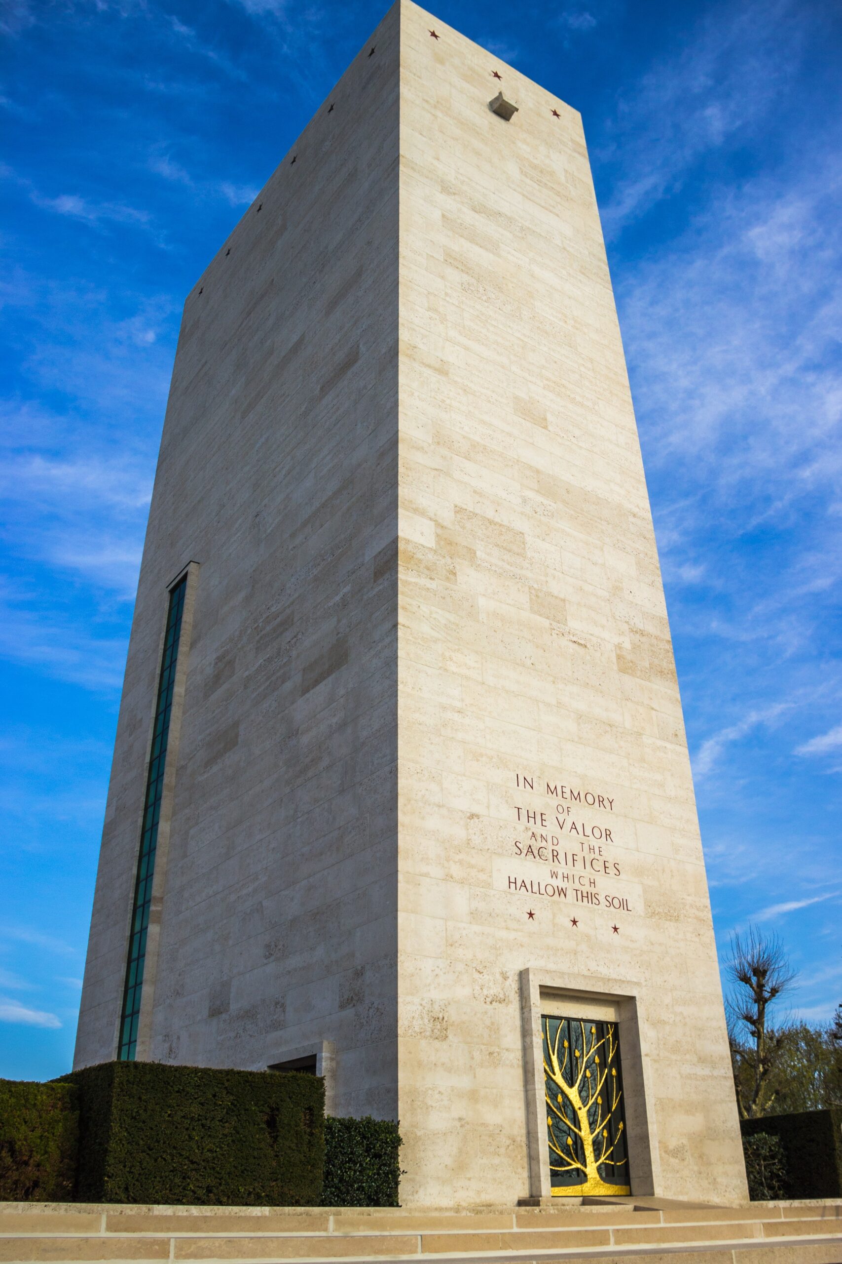 A tall brick building houses the chapel at Netherlands American Cemetery