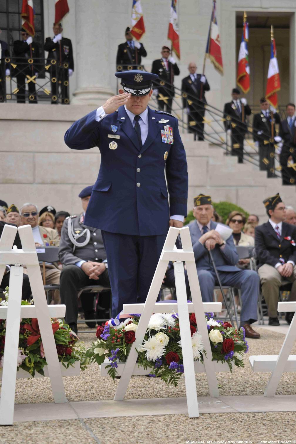 A U.S. military official lays a wreath during the 2015 Memorial Day Ceremony at Suresnes American Cemetery. Image courtesy of Jean Marc Cresson.