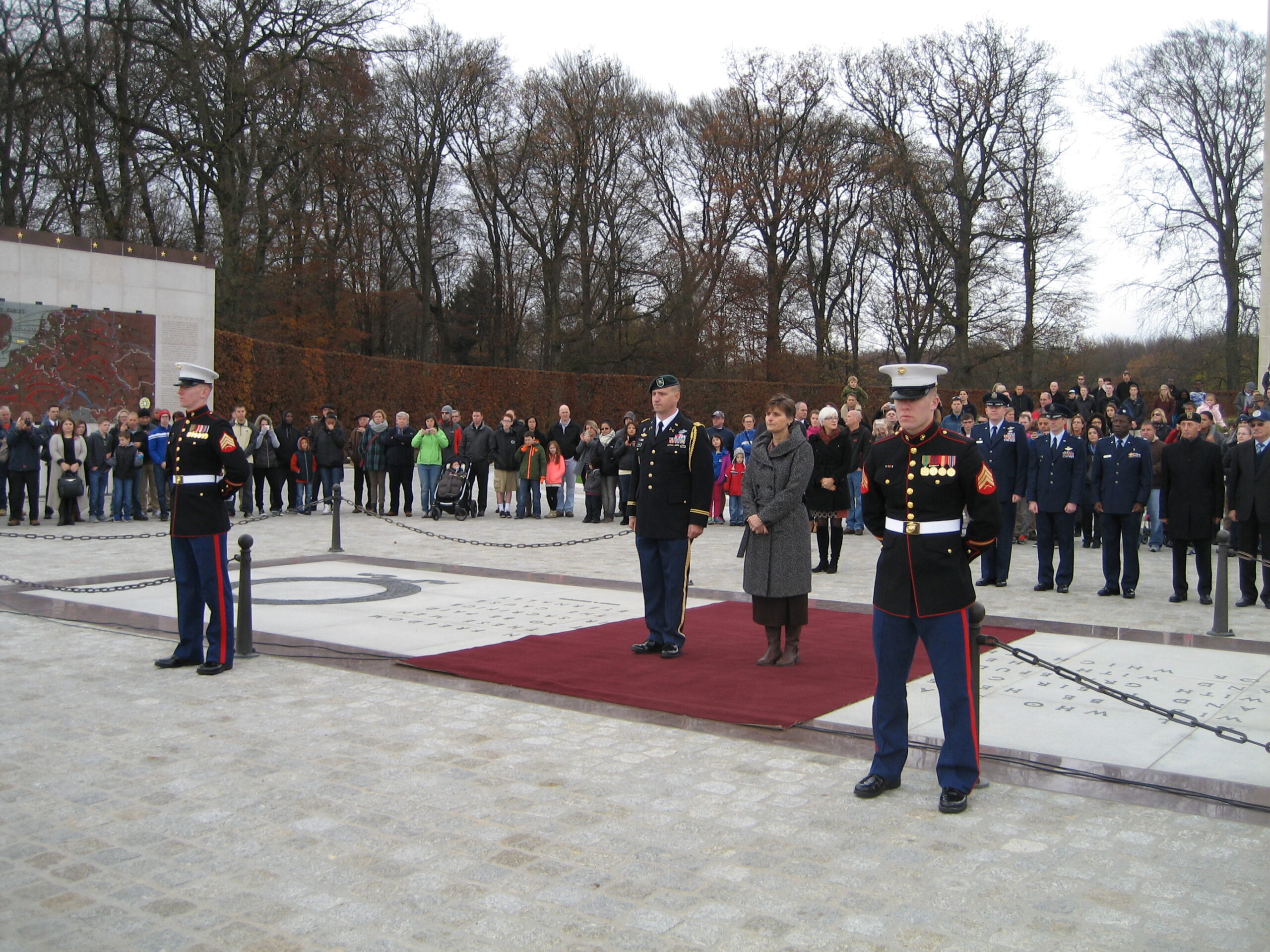 Members of the official party prepare to lay a wreath during the 2015 Veterans Day Ceremony at Luxembourg American Cemetery.