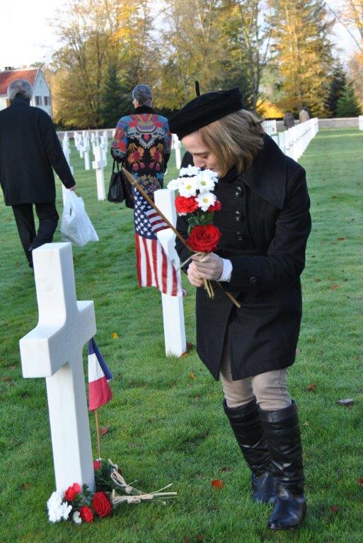 A local French citizen lays flowers at headstones after the 2013 Veterans Day Ceremony at Epinal American Cemetery in France.