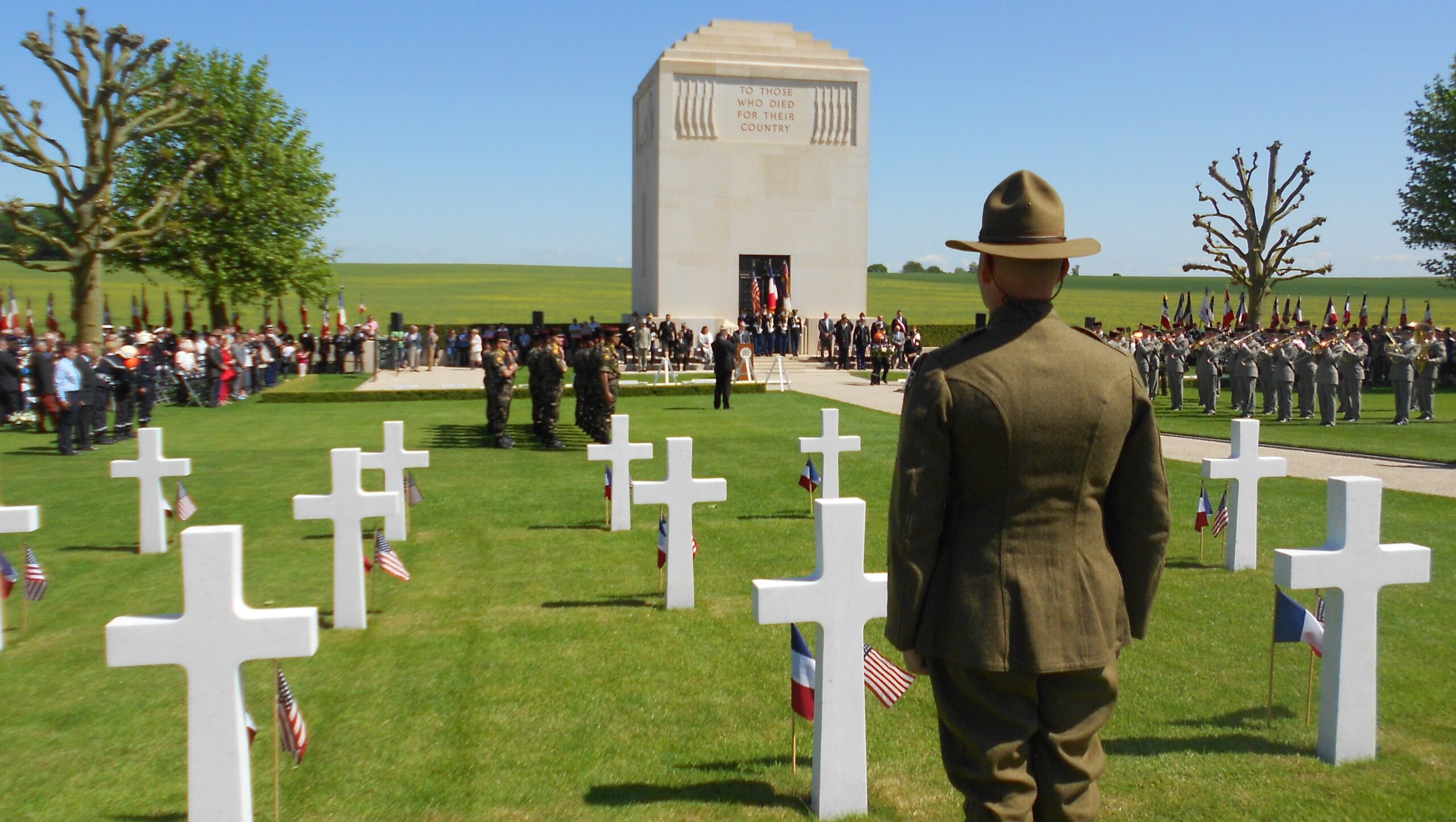 A World War I re-enactor stands within the plot area during the 2015 Memorial Day Ceremony at Somme American Cemetery. Image courtesy of Jackie Hays.