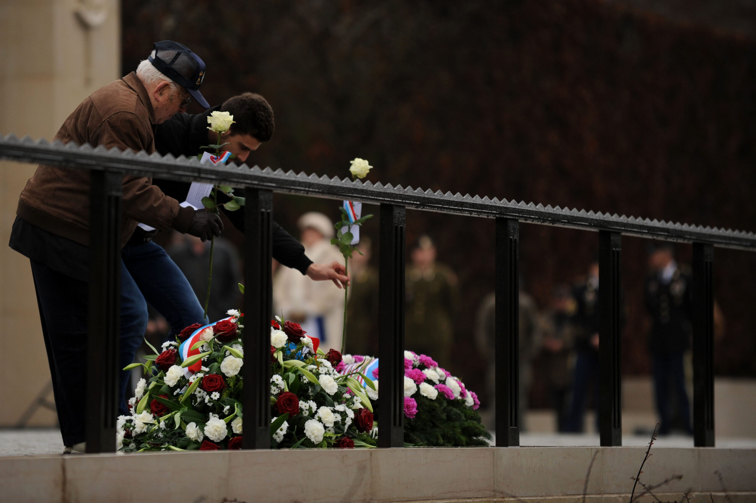 A WWII veteran along with an attendee lay white roses during the ceremony.
