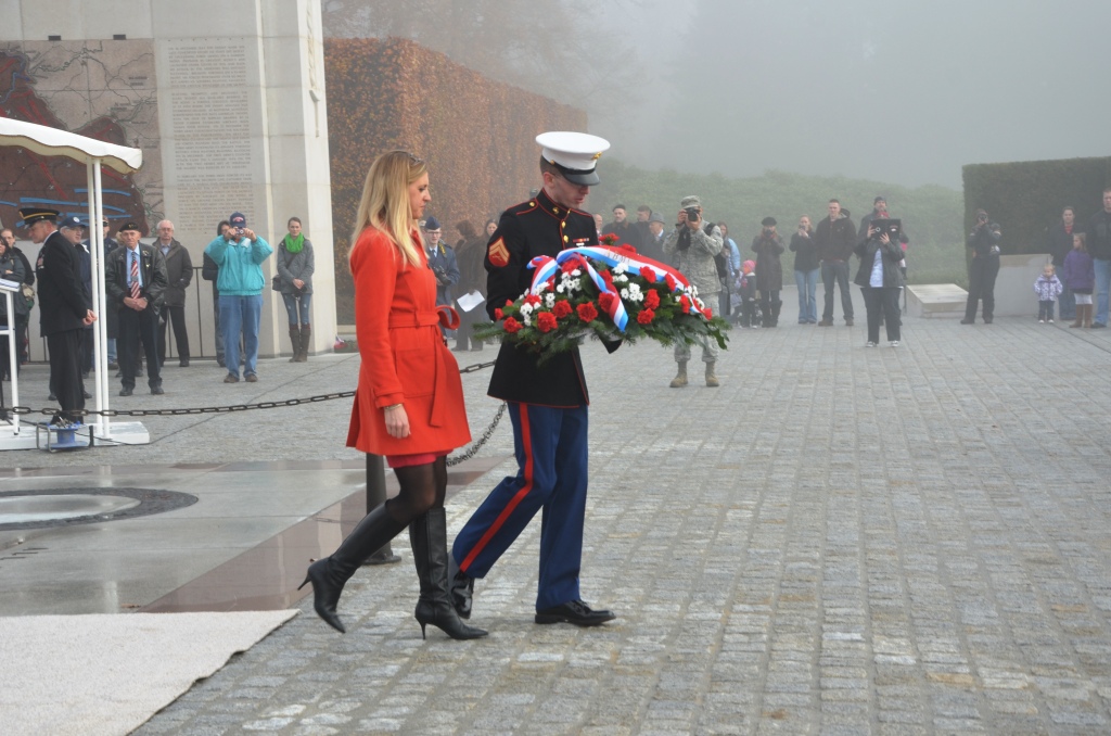 ABMC Commissioner Maura Sullivan prepares to lay a floral wreath during the 2013 Veterans Day Ceremony at Luxembourg American Cemetery.