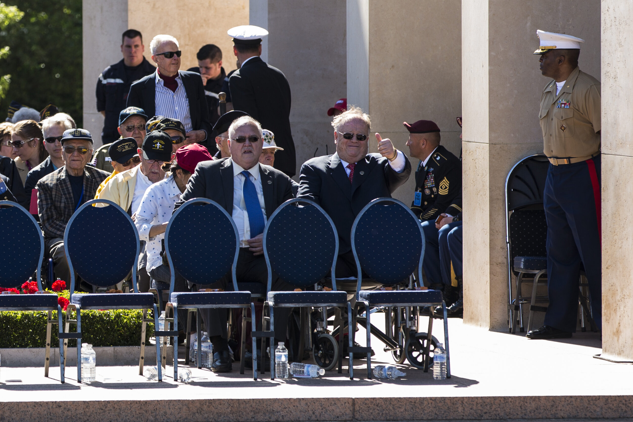 ABMC Secretary Max Cleland sat onstage with the veterans of World War II during the ceremony for the 70th anniversary of D-Day at Normandy American Cemetery.