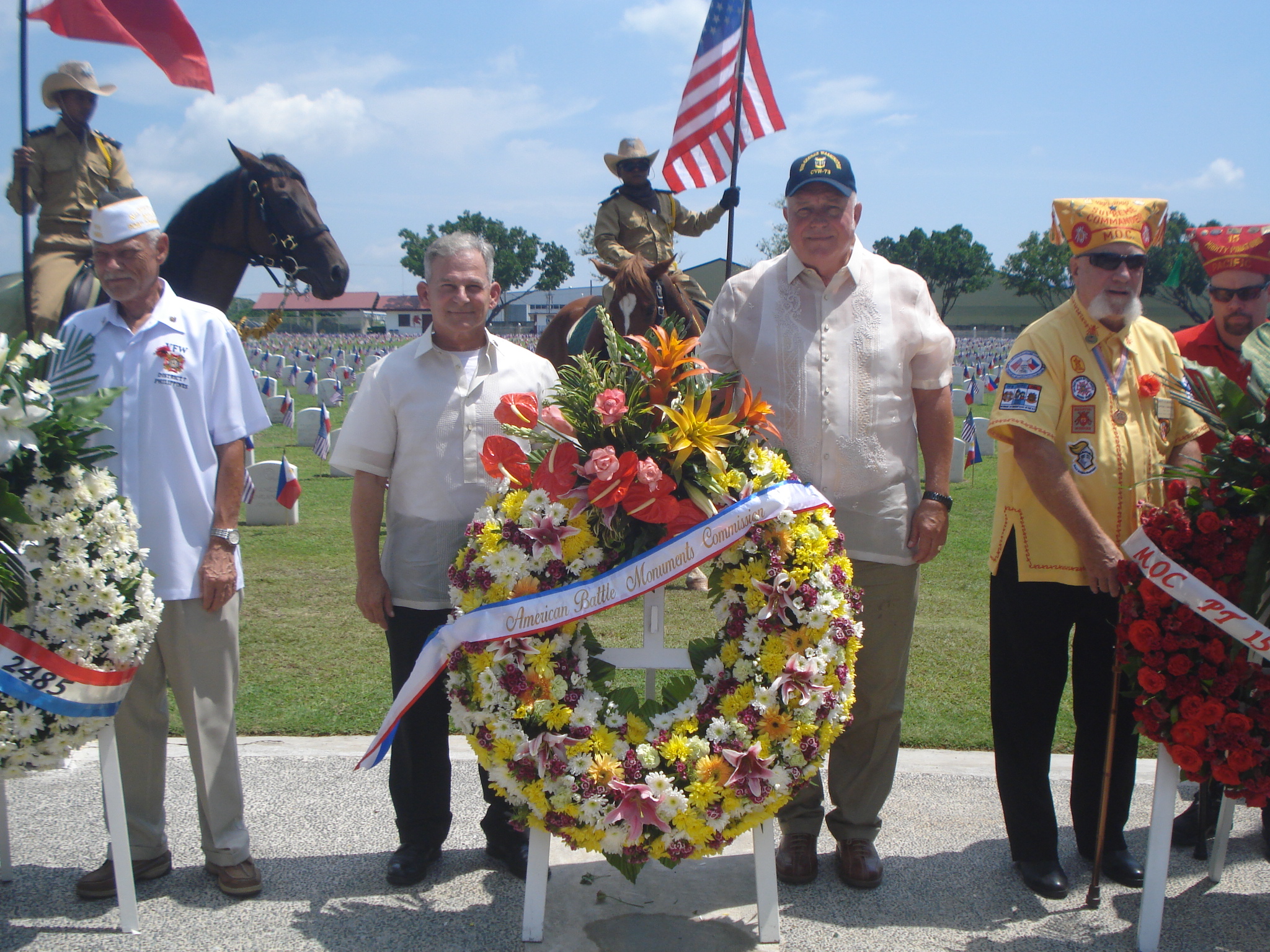 Manila American Cemetery Assistant Superintendent Bert Caloud and Superintendent Larry Adkison stand next to ABMC's floral wreath during the 2015 Memorial Day Ceremony at Clark Veterans Cemetery.