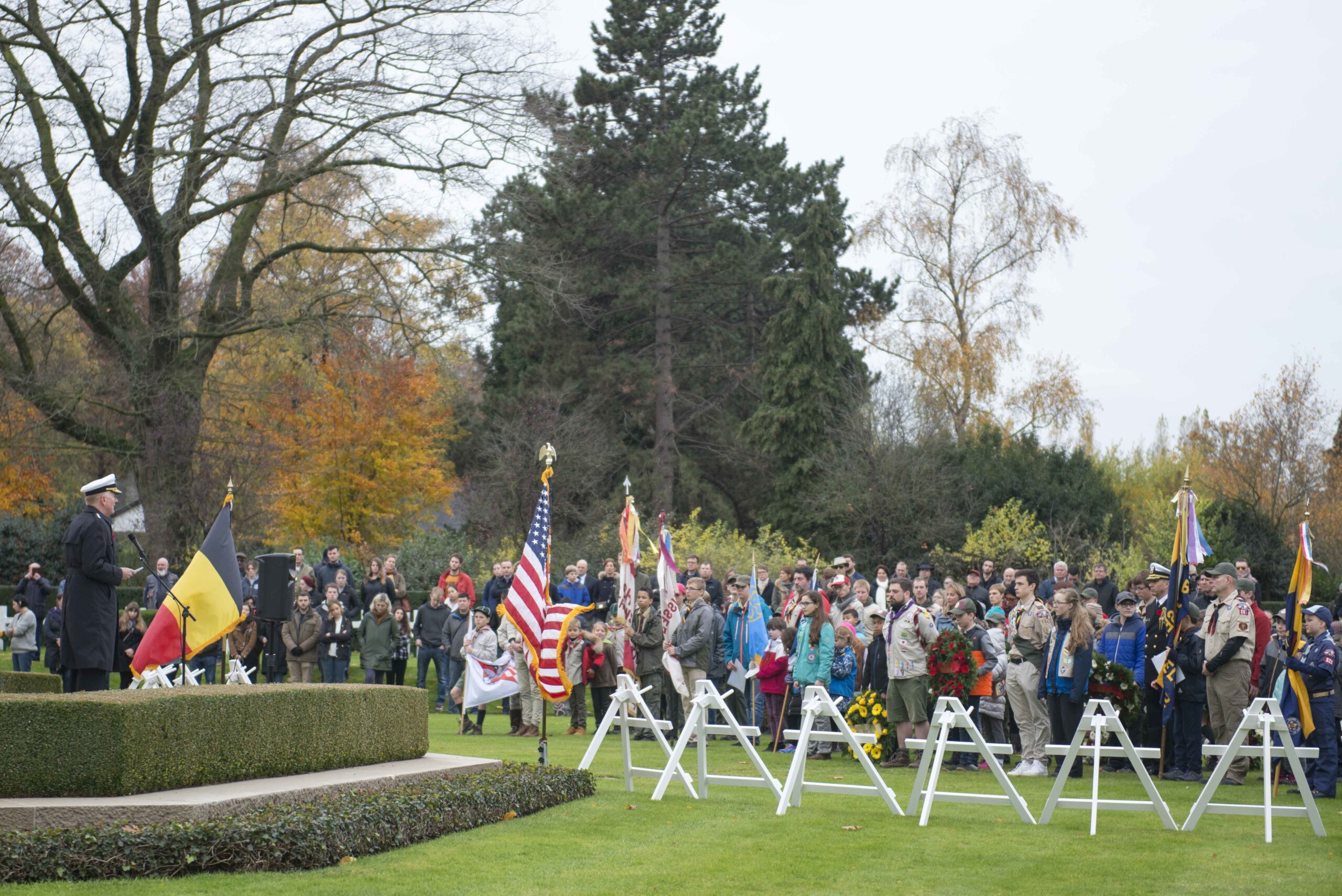 Adm. James G. Foggo III, commander, U.S. Naval Forces Europe-Africa and Allied Joint Force Command Naples, Italy, delivers remarks during the centennial anniversary commemoration of Armistice Day at Flanders Field American Cemetery in Waregem, Belgium, Nov. 11, 2018. (U.S. Navy photo by Mass Communication Specialist 1st Class Ryan Riley/Released)