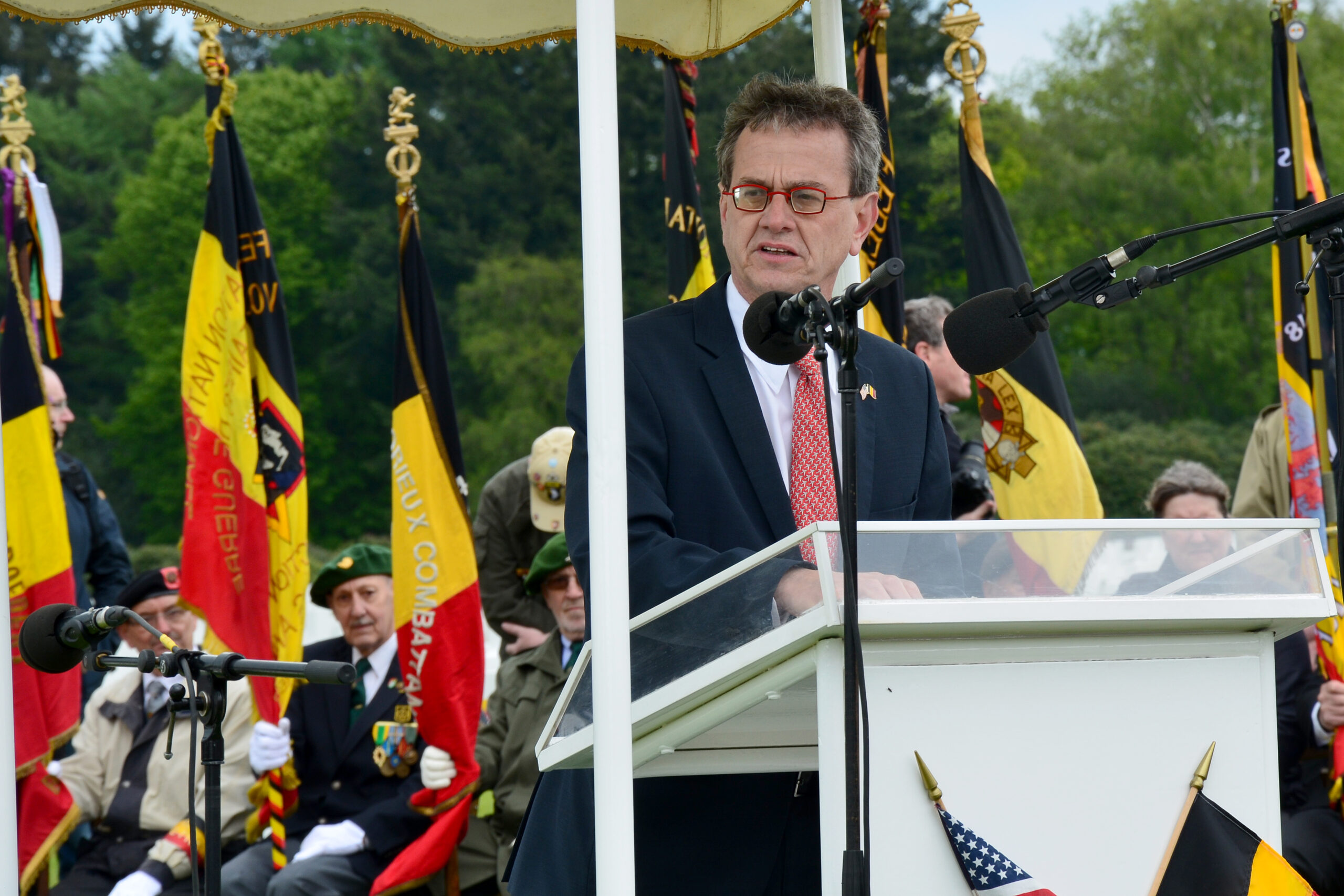 U.S. Ambassador to Belgium Howard Gutman delivers remarks during the 2013 Memorial Day ceremony at Henri-Chapelle American Cemetery in Belgium.