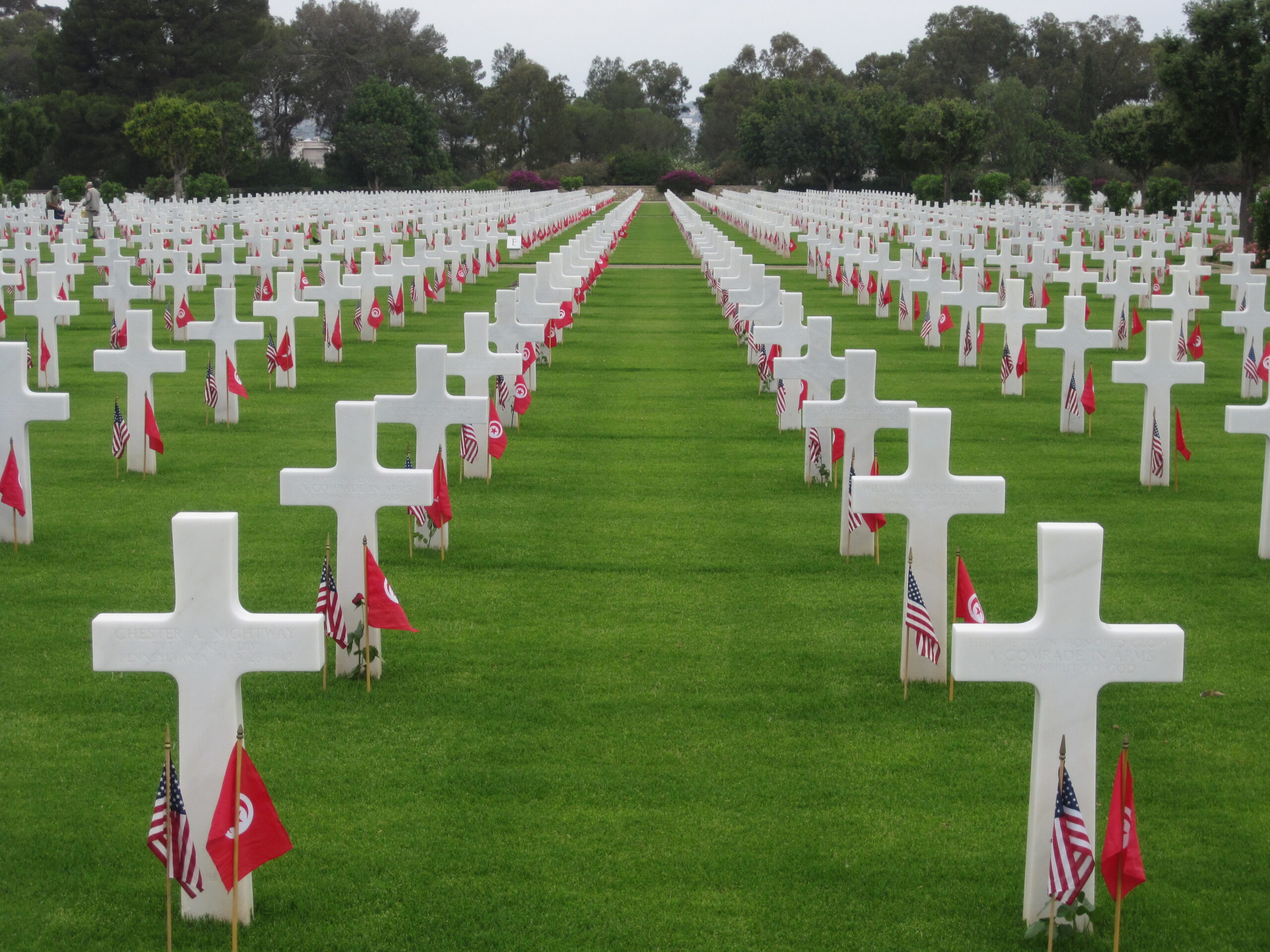 American and Tunisian flags at the base of every headstone in the cemetery.