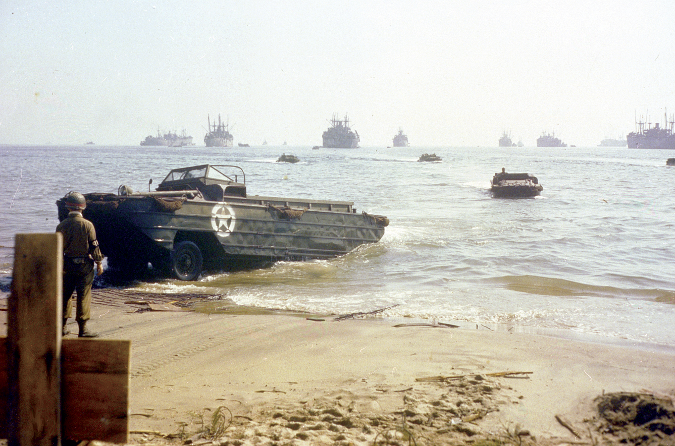 Amphibian trucks (DUKWs) bring supplies to a landing beach in Southern France in August 1944.