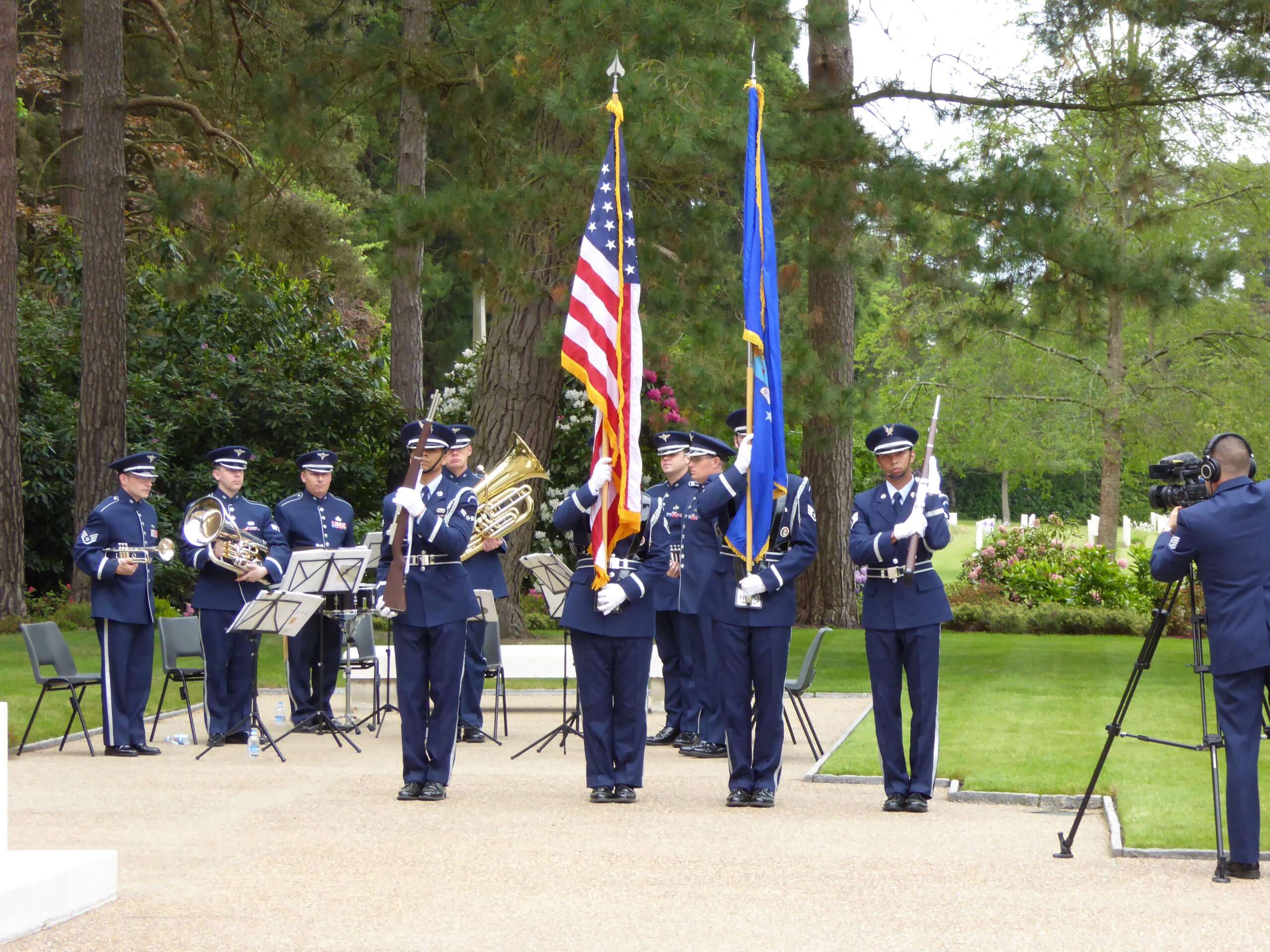An American Color Guard and Brass Air Force Band participate in the ceremony.