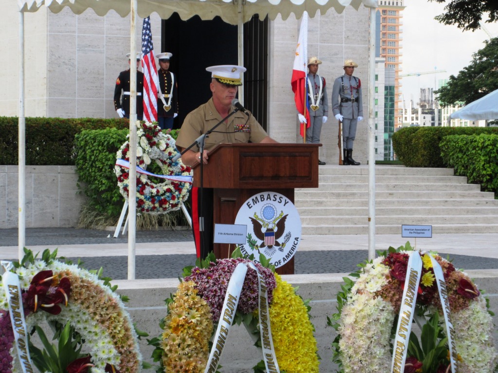 An American military official delivers remarks during the 2015 Memorial Day Ceremony at Manila American Cemetery.