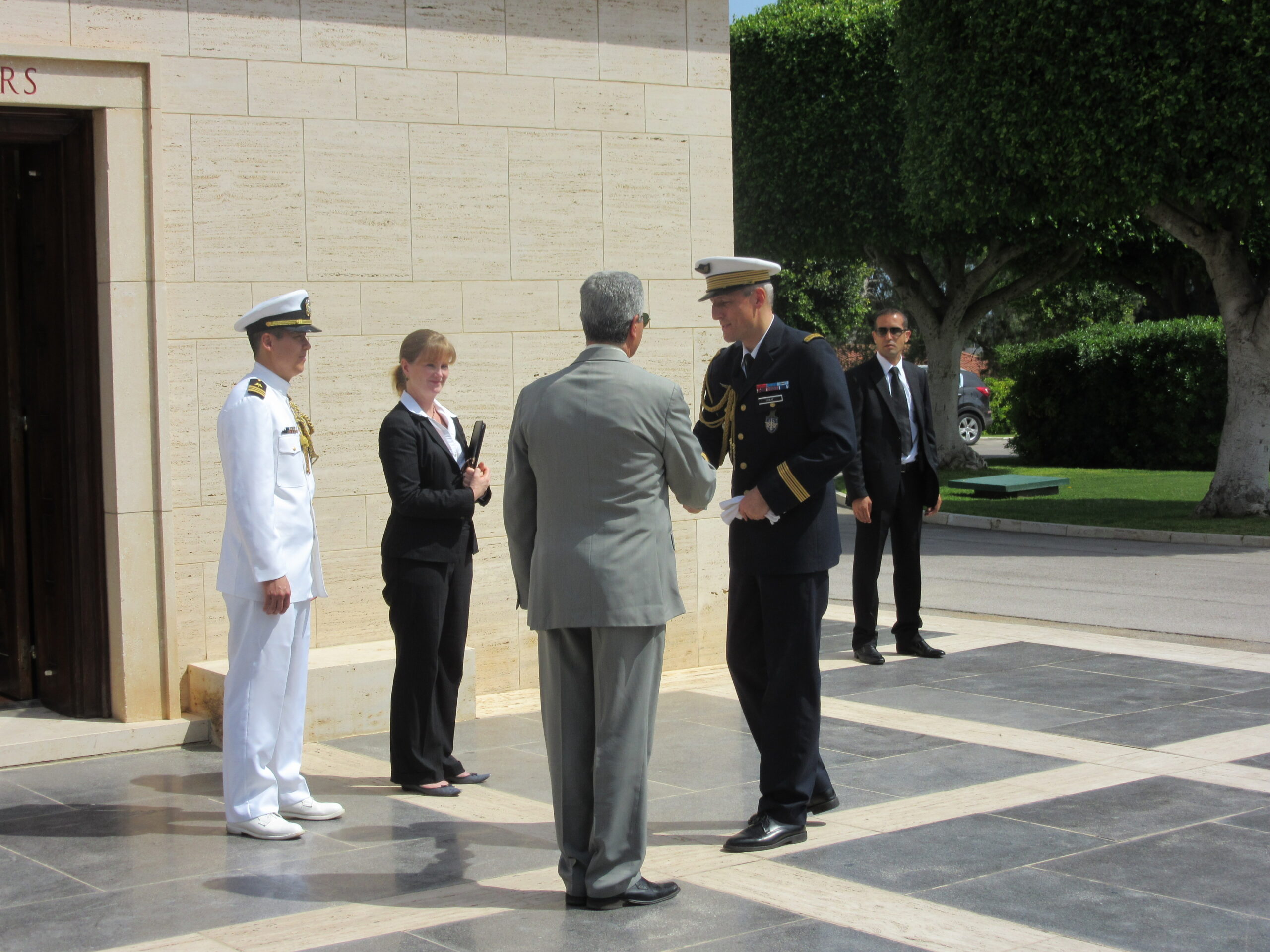 An American military officials shakes hands with Superintendent Foued Bouaziz during the 2015 Memorial Day Ceremony at North Africa American Cemetery.