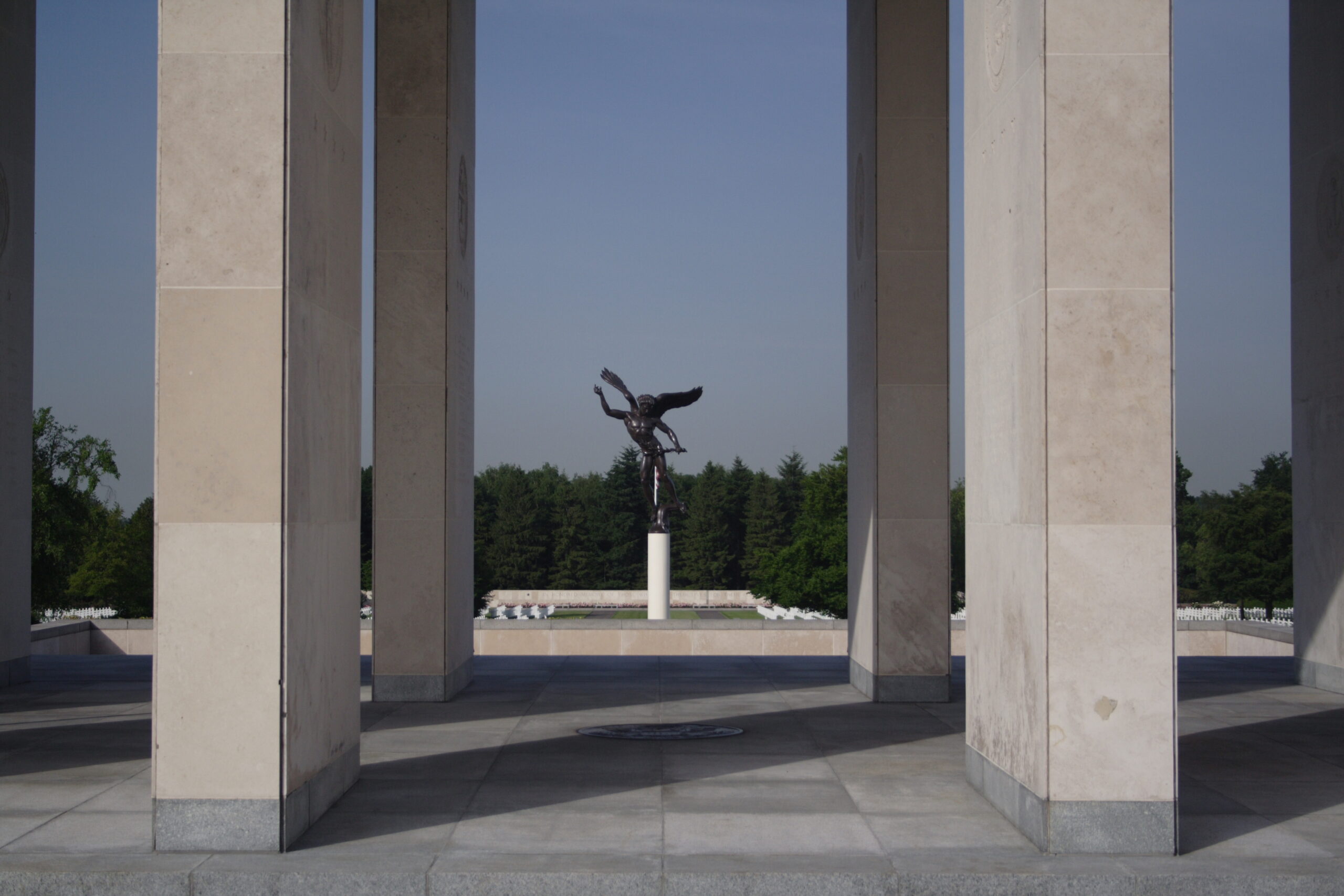An angel statue viewed through the columns of the Henri-Chapelle American Cemetery memorial building.