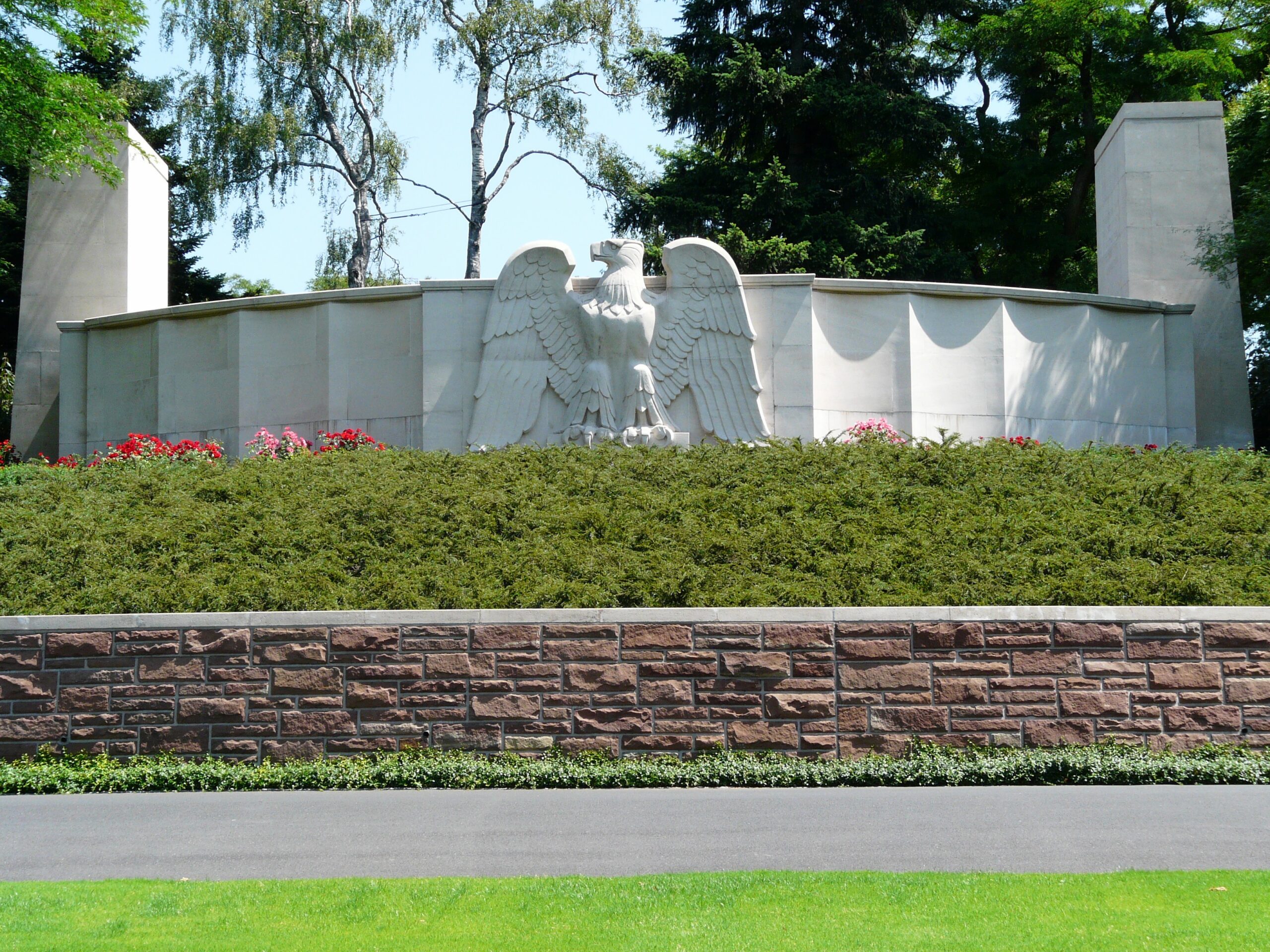 An eagle sculpture adorns the entrance to Lorraine American Cemetery.