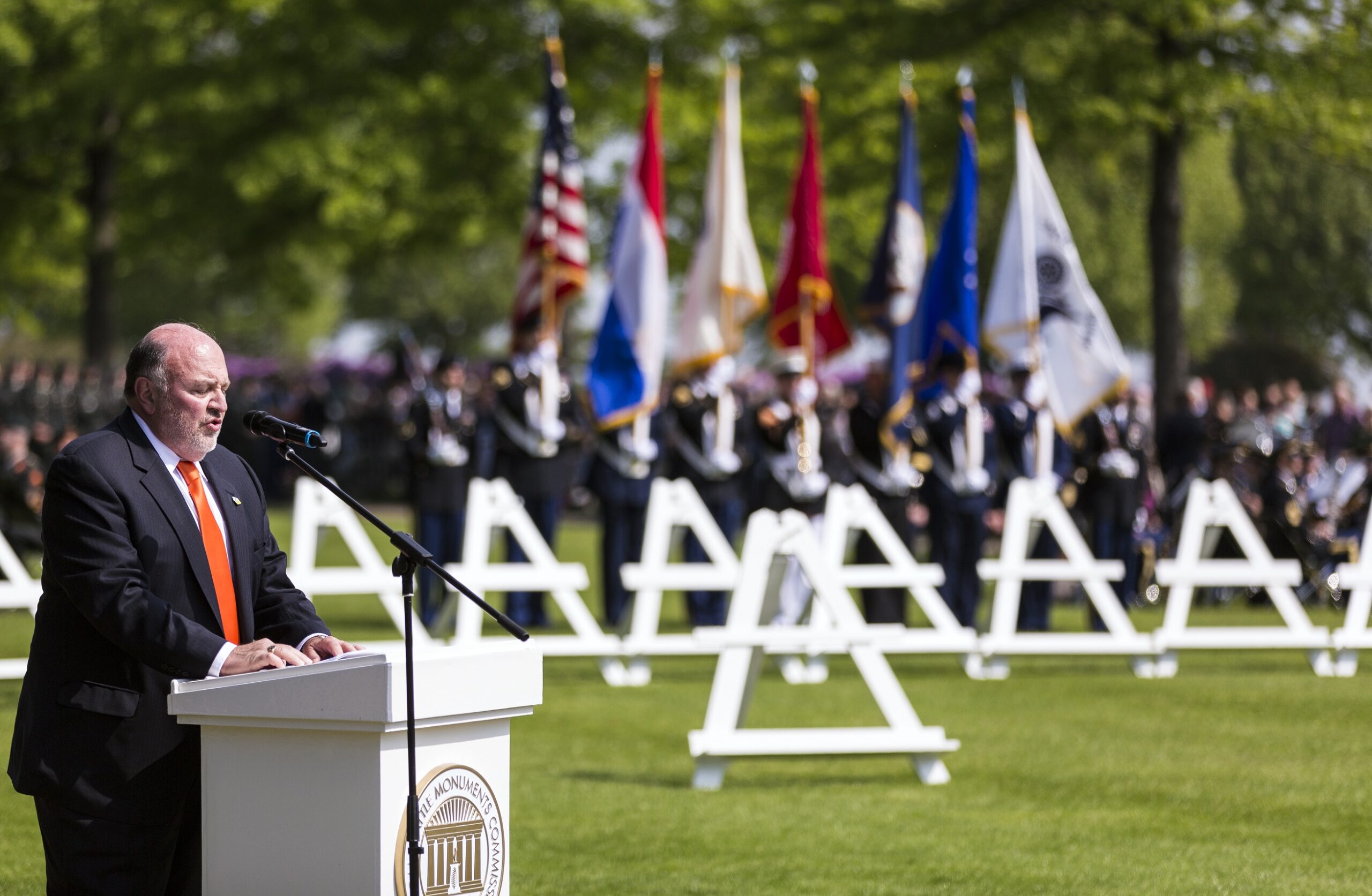 Arthur Chotin delivers remarks during the ceremony at Netherlands American Cemetery.