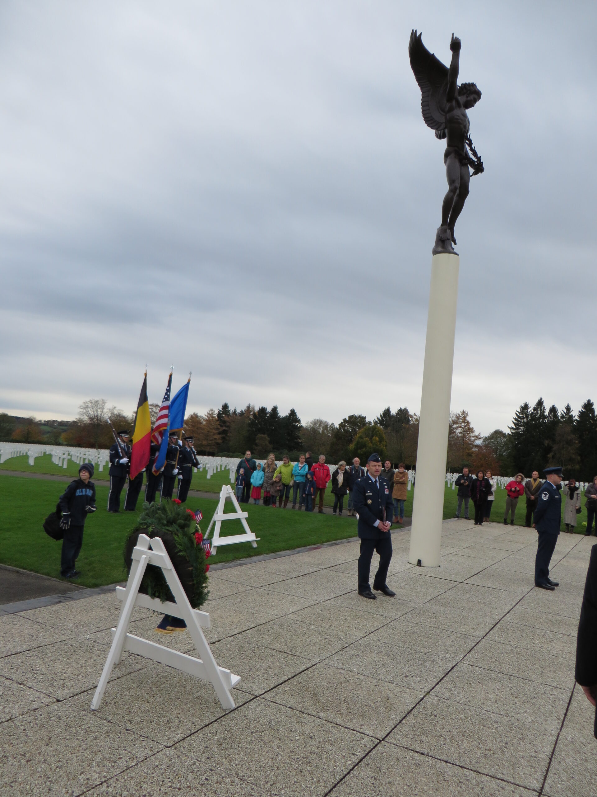Ceremony attendees and participants stand near the angel statue at Henri-Chapelle American Cemetery during the 2014 Veterans Day Ceremony.