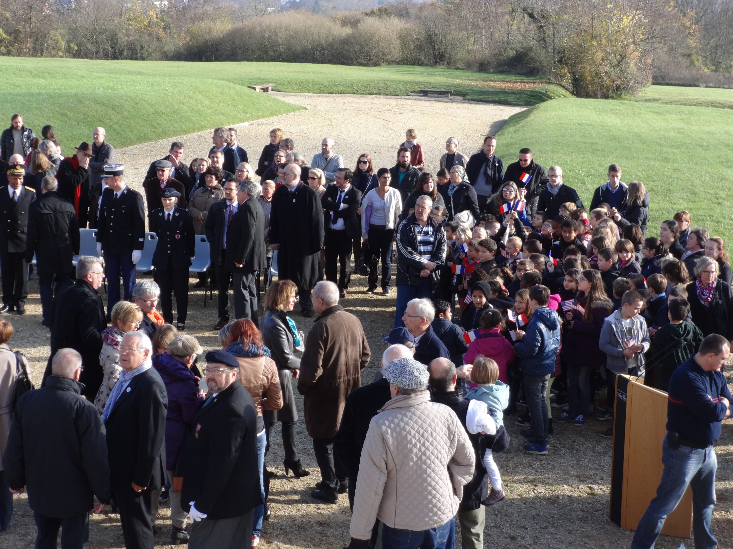 School children and local citizens gather at the Chateau-Thierry American Monument for the Veterans Day/Armistice Day ceremony.