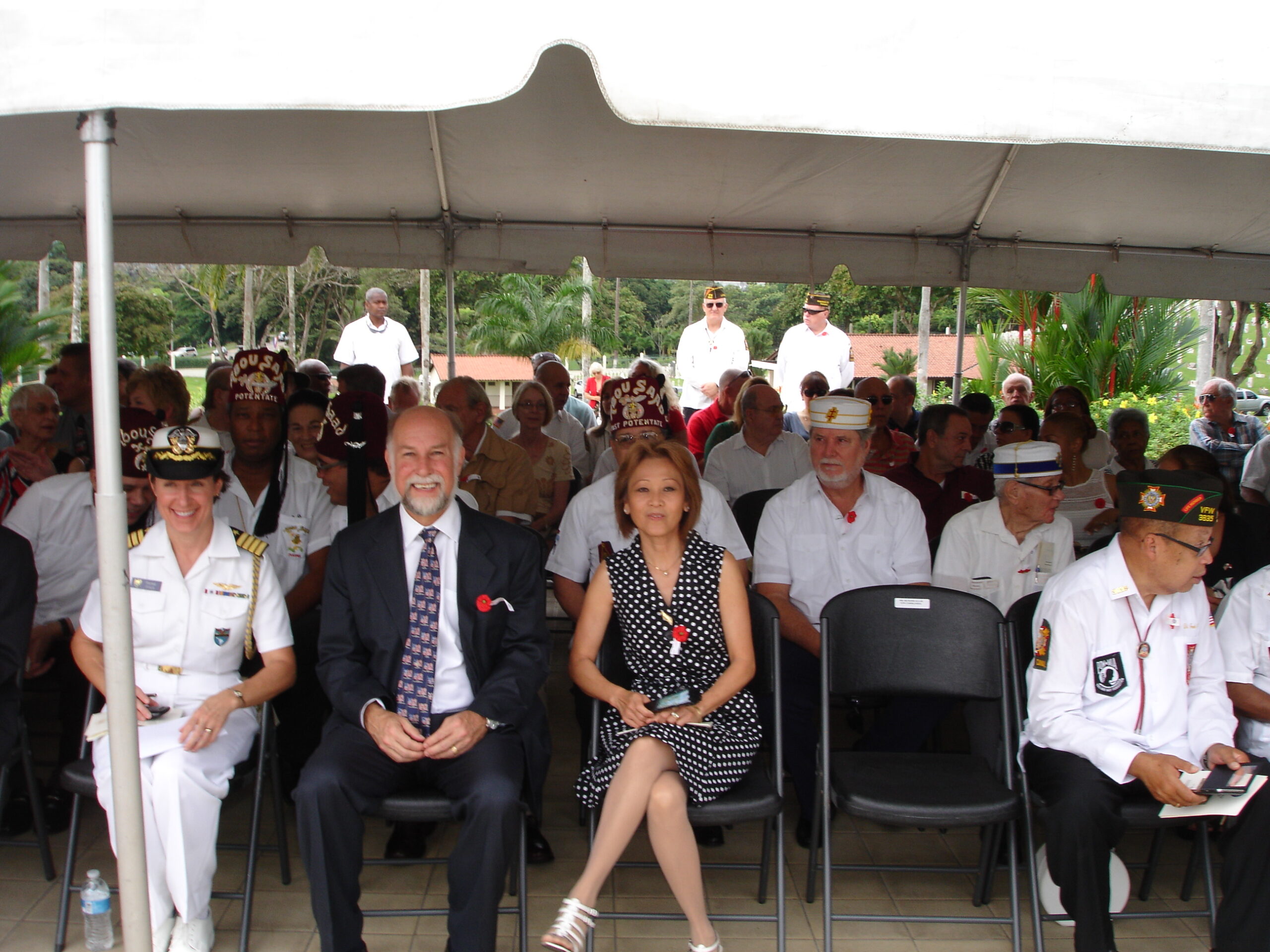 Attendees sit under a tent for the ceremony.