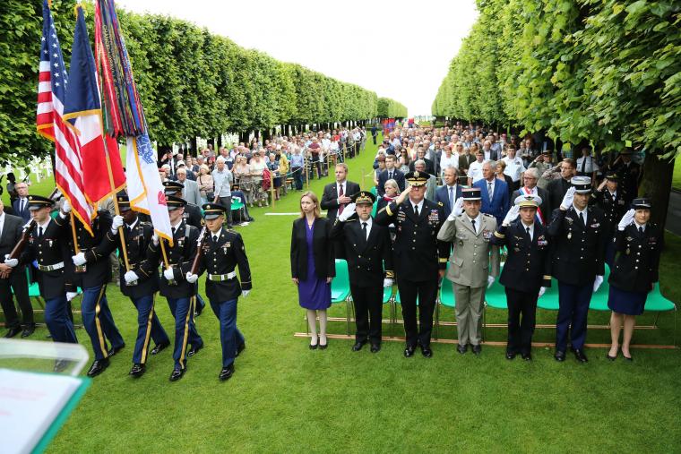 Attendees stood during the start of the 2018 Memorial Day Ceremony at St. Mihiel American Cemetery in France.