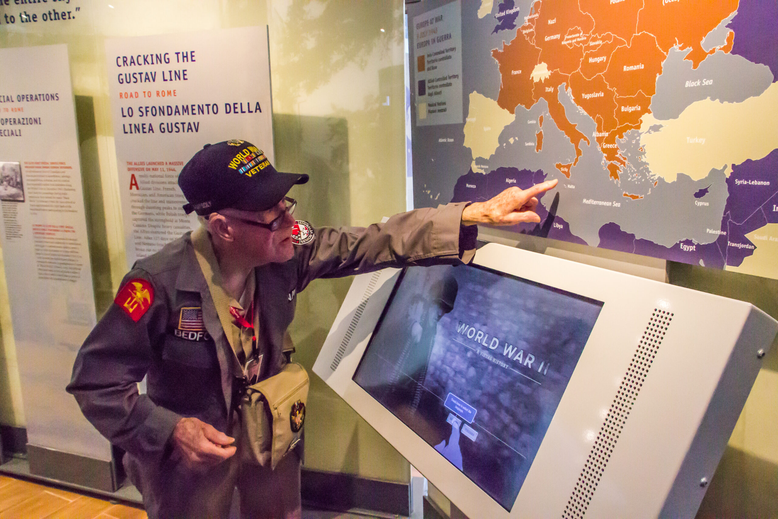 WWII Navy veteran Lt. Robert Bedford explains at the Sicily-Rome Visitor’s Center how he provided naval support during the invasion of Sicily. Bedford entered the service in 1942
