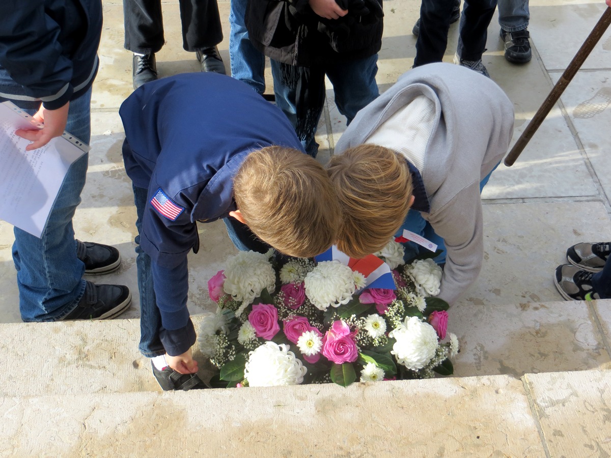Boy Scouts lay a wreath during the 2013 Veterans Day Ceremony at Flanders Field American Cemetery in Belgium.