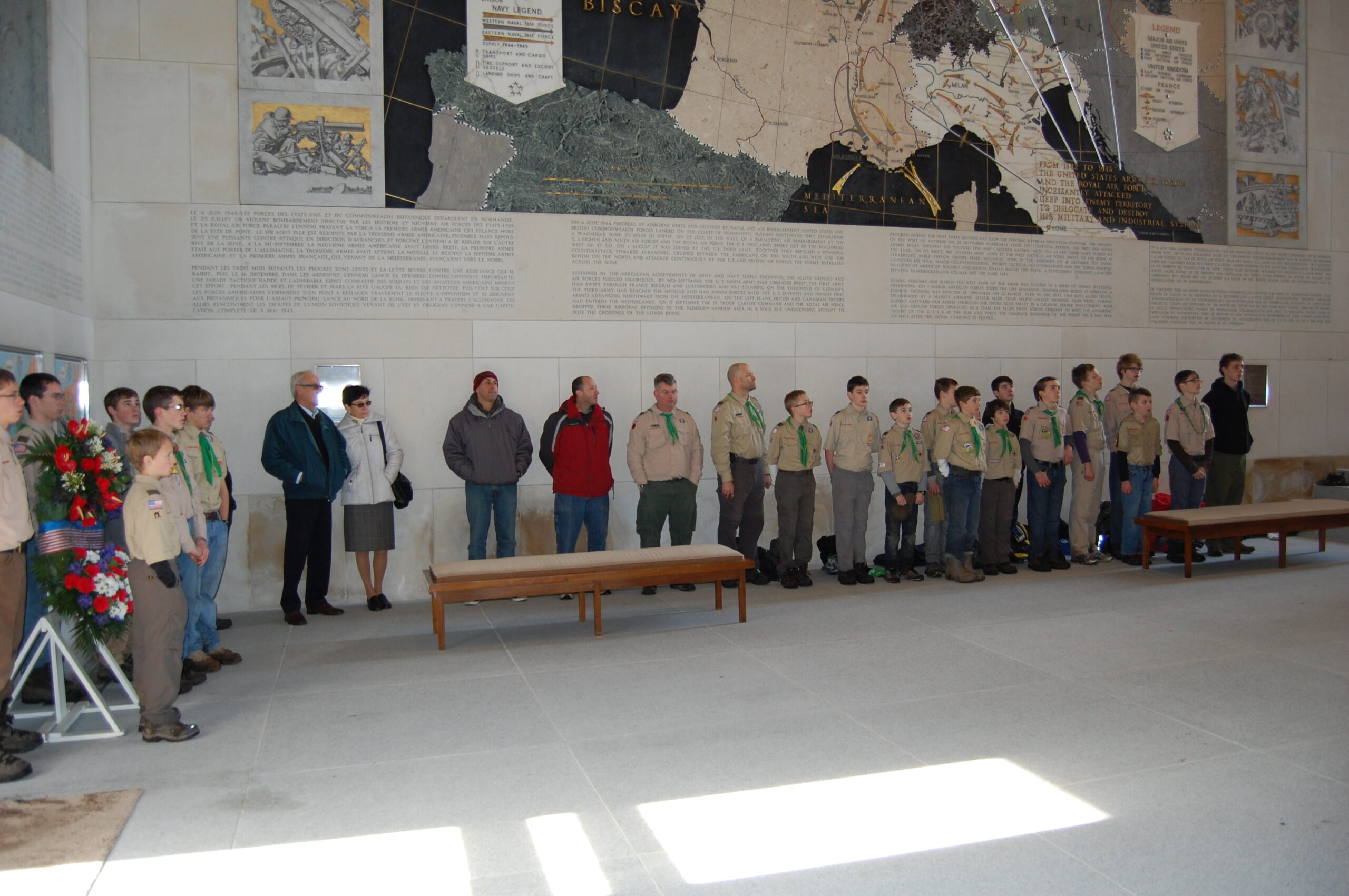 Boy Scouts stand in the chapel, waiting for the ceremony to begin.
