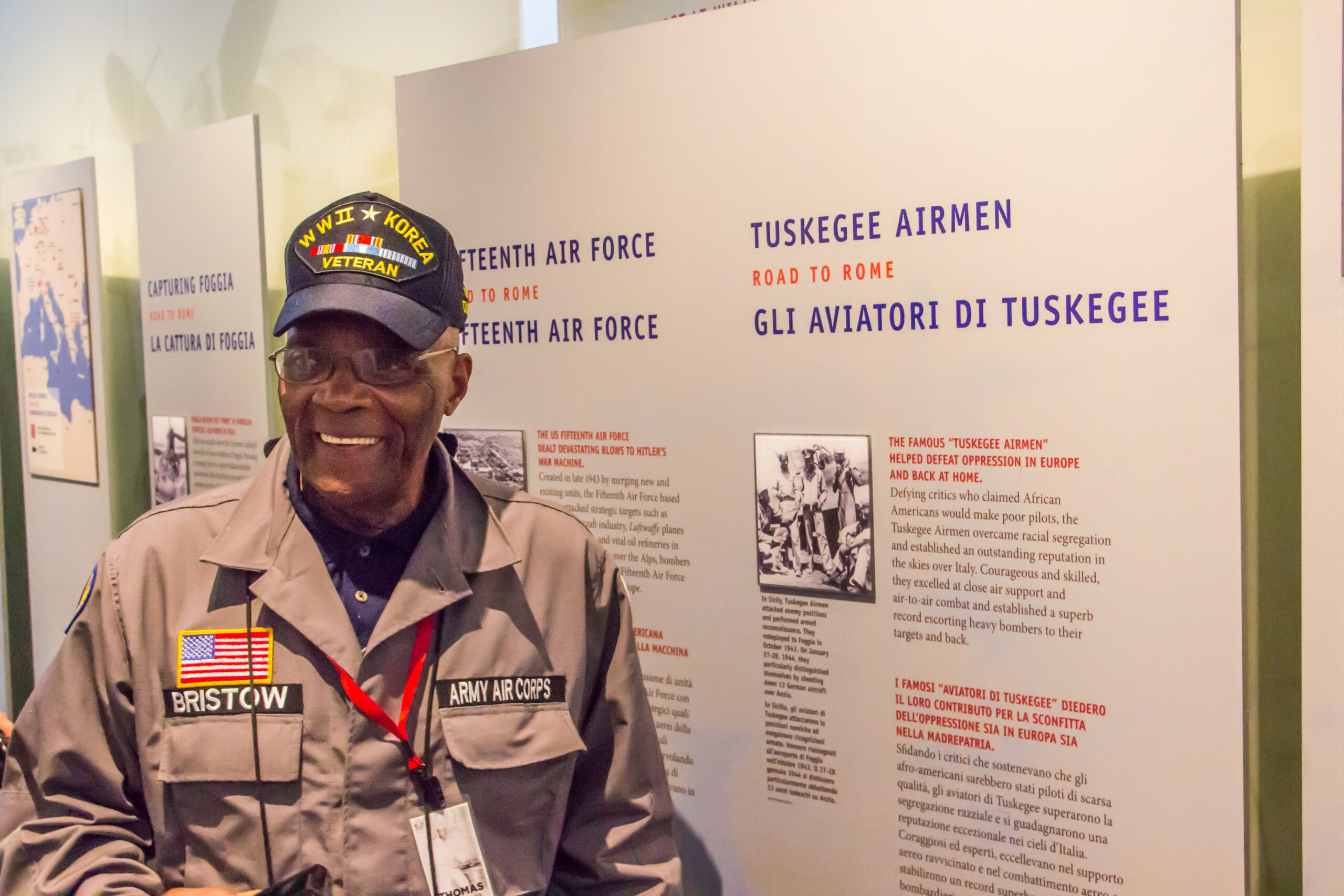 WWII veteran Thomas Bristow stands next to the Tuskegee Airmen panel at the Sicily-Rome Visitor’s Center. Bristow was a part of the famed Tuskegee Airmen (332nd Fighter Group)