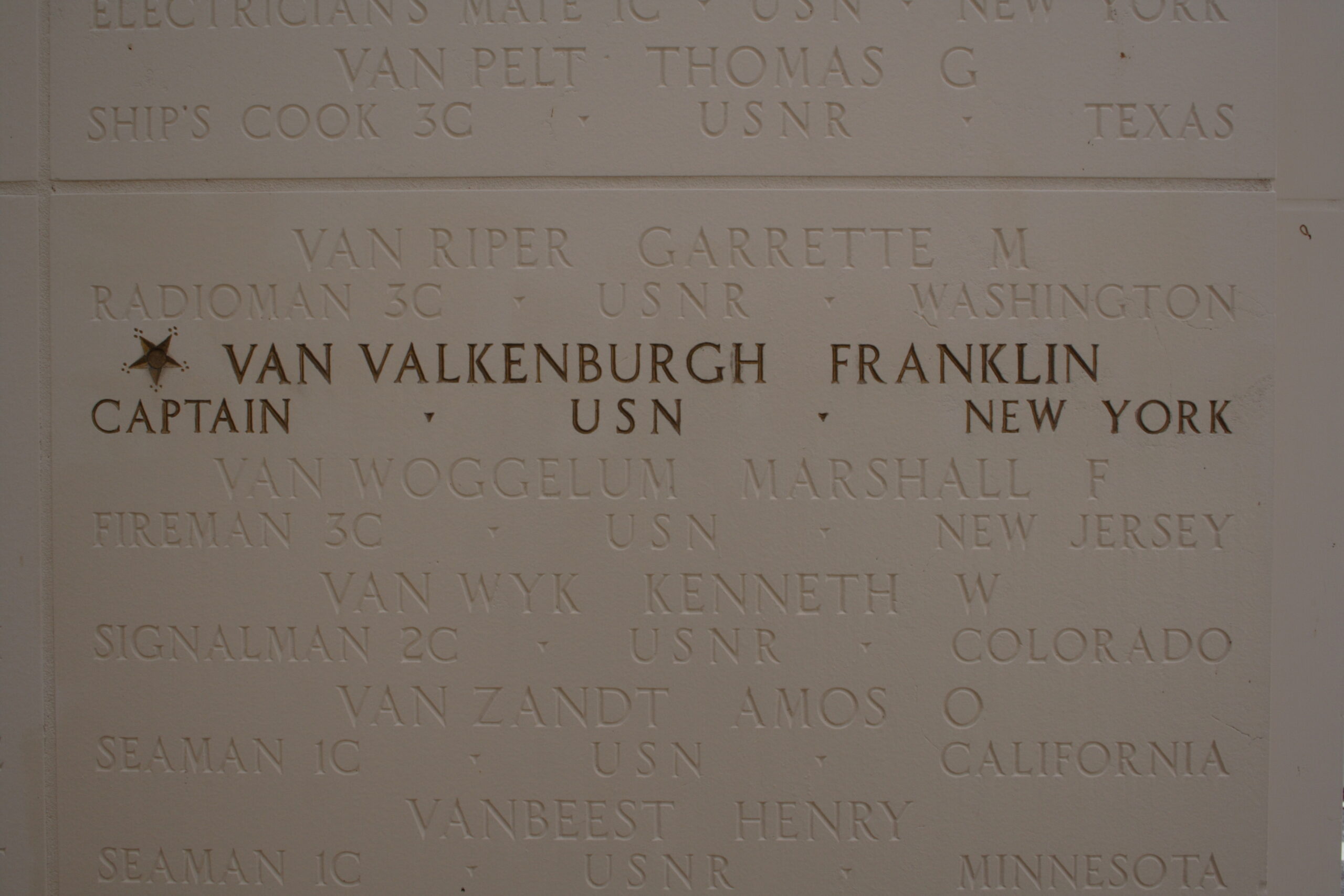 Detail of the Walls of the Missing from the Honolulu Memorial. Captain Franklin Van Valkenburgh