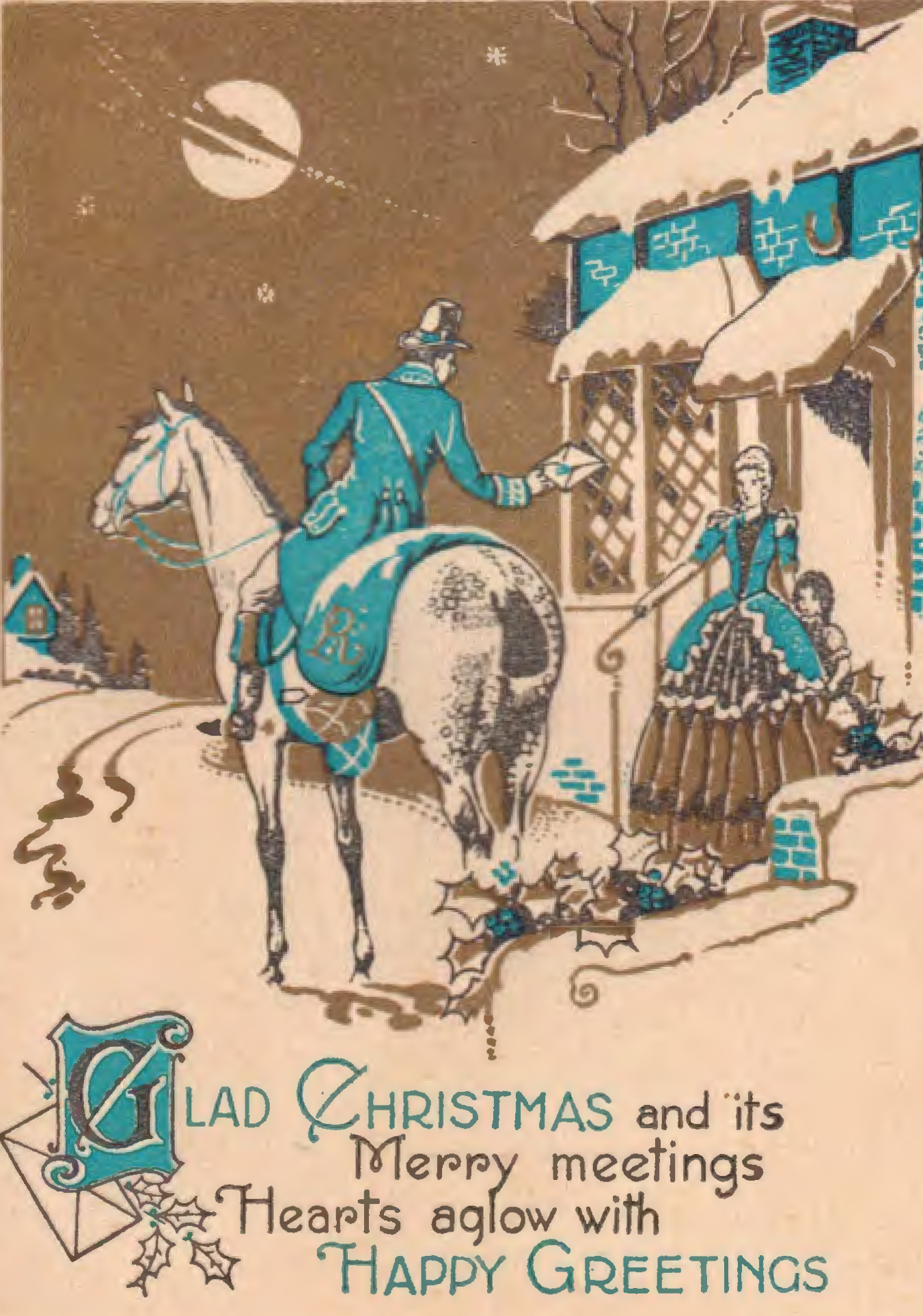 Card reads “Glad Christmas and it’s Merry meetings Hearts aglow with Happy Greetings.”